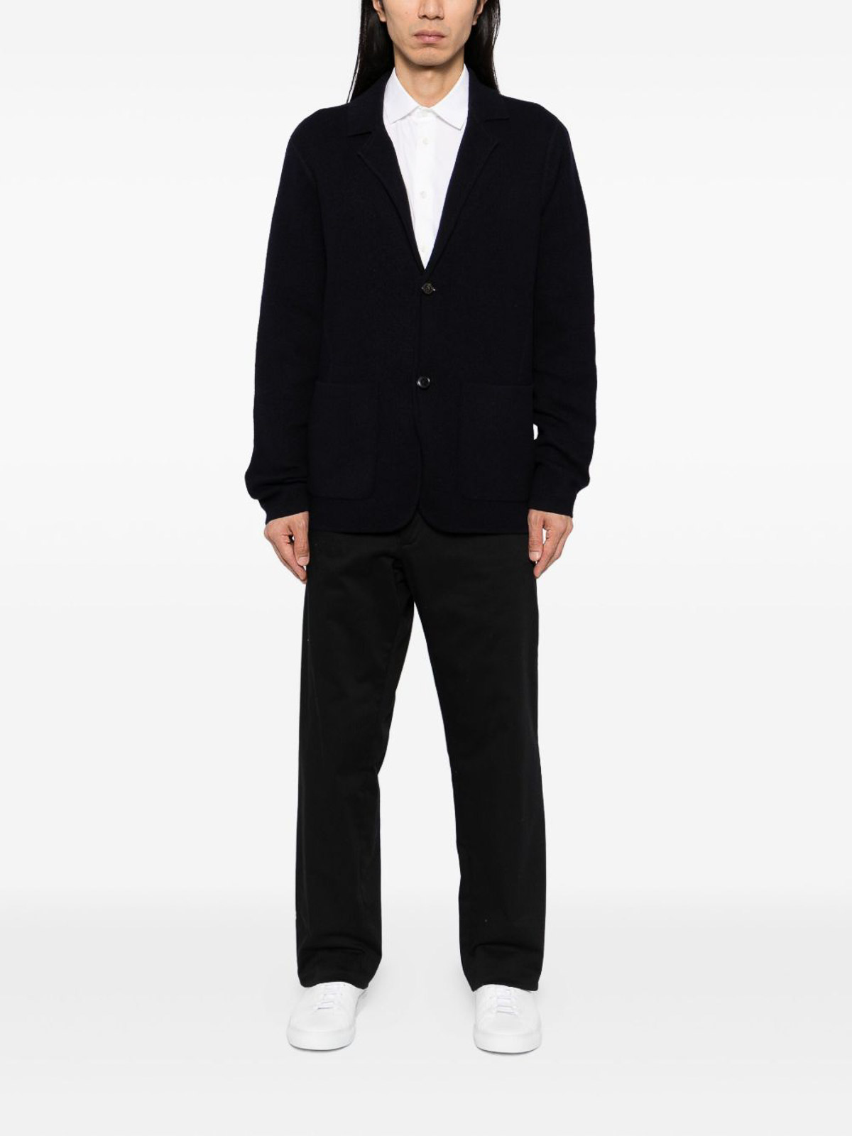 Dark blue knit jacket with buttoned front and long sleeves. two front patch pockets.