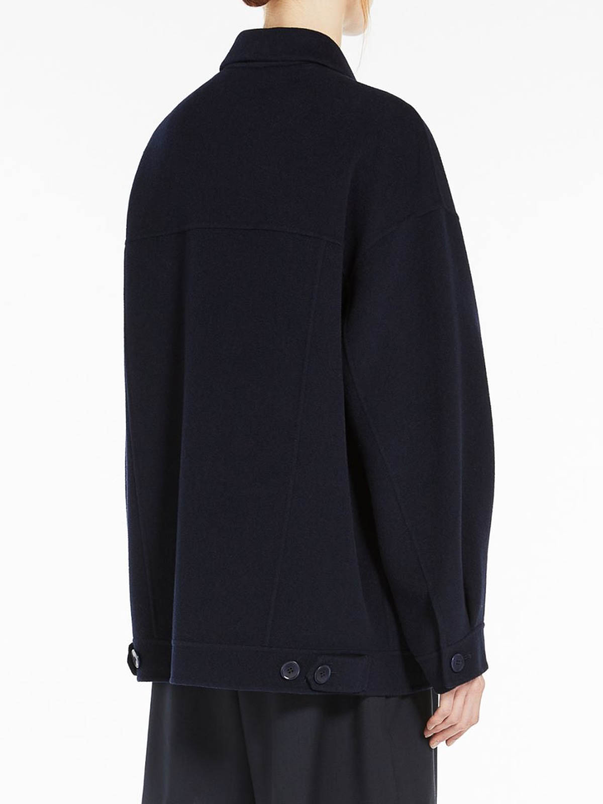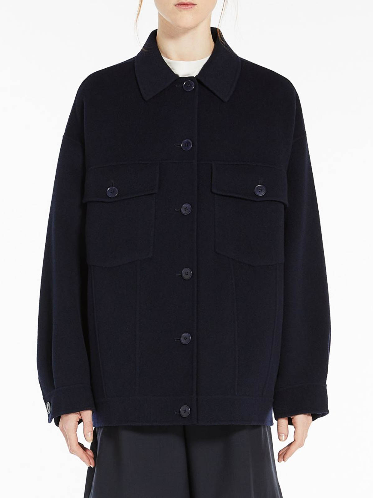 Mida coat; 100% virgin wool; Overse short coat, classic shirt collar, pockets with flap and button applied on the chest and low pockets with vertical fillet
