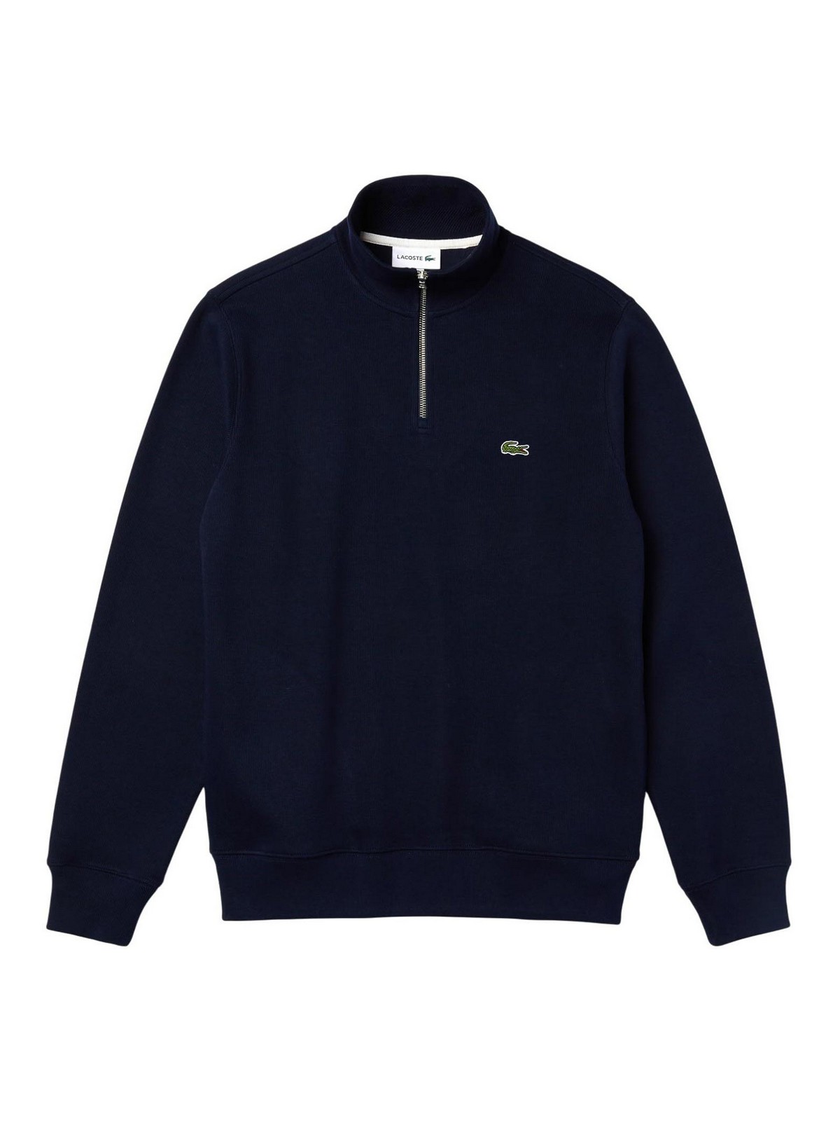 Lacoste high-neck interlock sweatshirt with blue zip, Lacoste high-neck sweatshirt with an essential and refined design, designed as an essential item in the everyday wardrobe. made of ribbed cotton interlock, it combines natural comfort and clean structure. the classic cut and the refined details, such as the chevron jacquard motif inside the neck, define a casual chic aesthetic signed by the crocodile embroidered on the chest. ribbed cotton interlock classic fit with comfortable cut high collar with zip chevron jacquard motif inside the collar crocodile embroidered on the chest, composition, cotton: 100%, garment care, machine wash at maximum 30c on a normal cycle do not bleach do not tumble dry iron at medium temperature (maximum 150c) do not dry clean line dry
