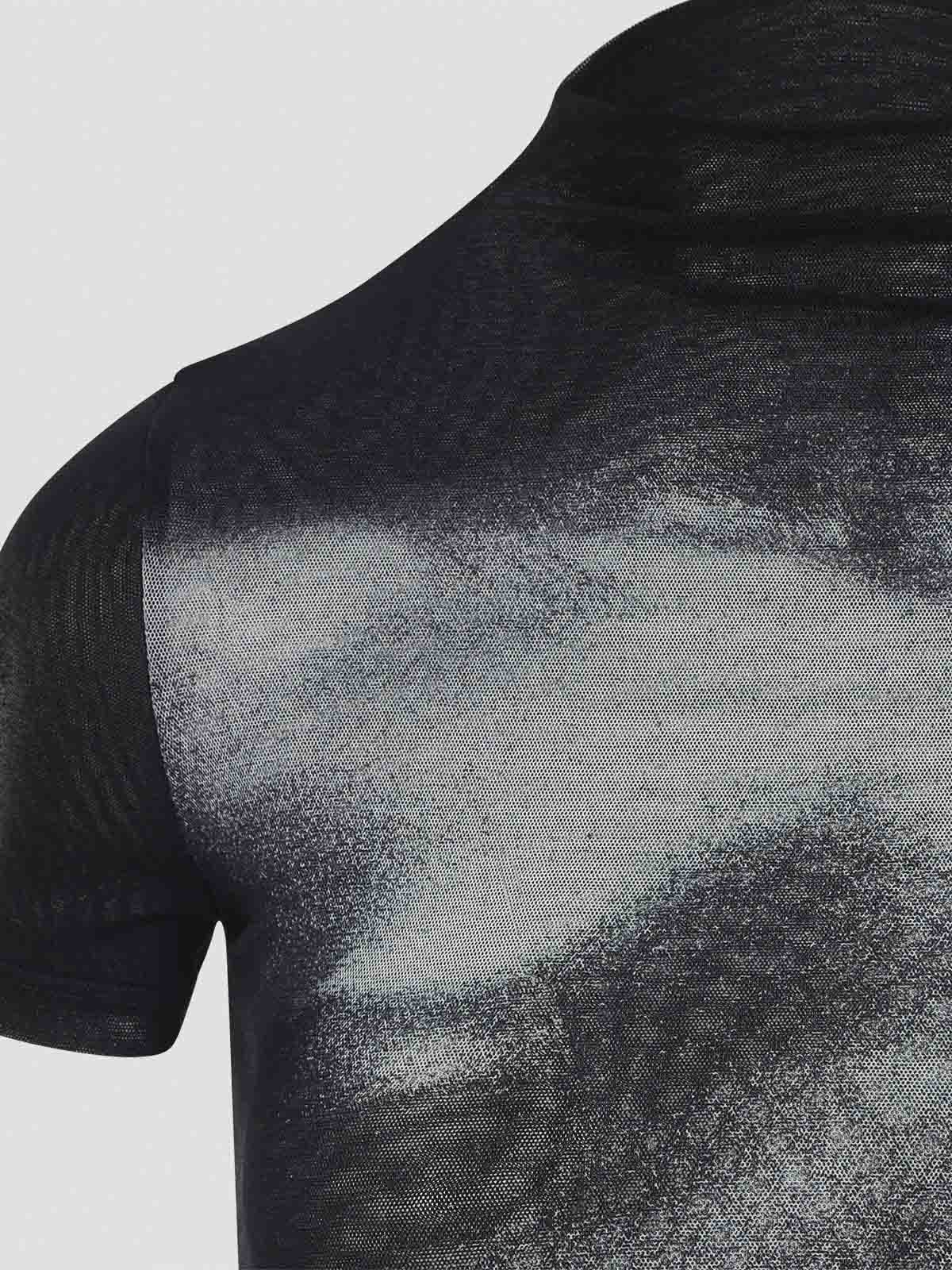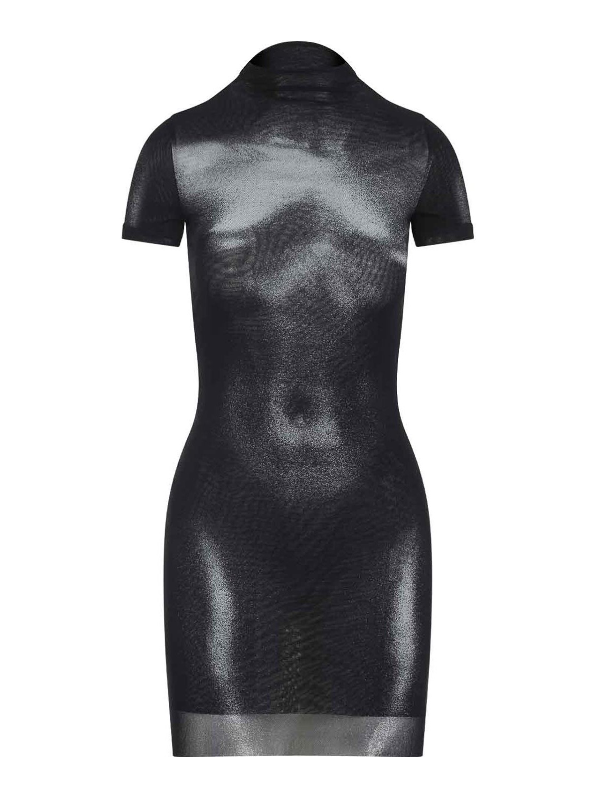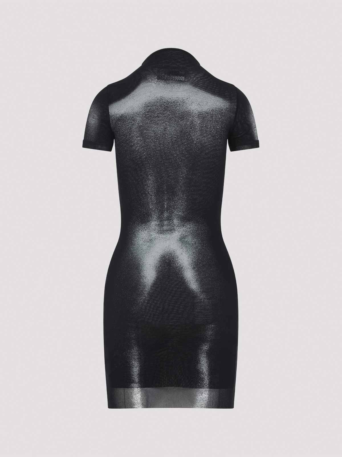 Jean paul gaultier body dust black mini dress crafted from black mesh, toned all, over graphic print standing collar short sleeves straight hem slim fit