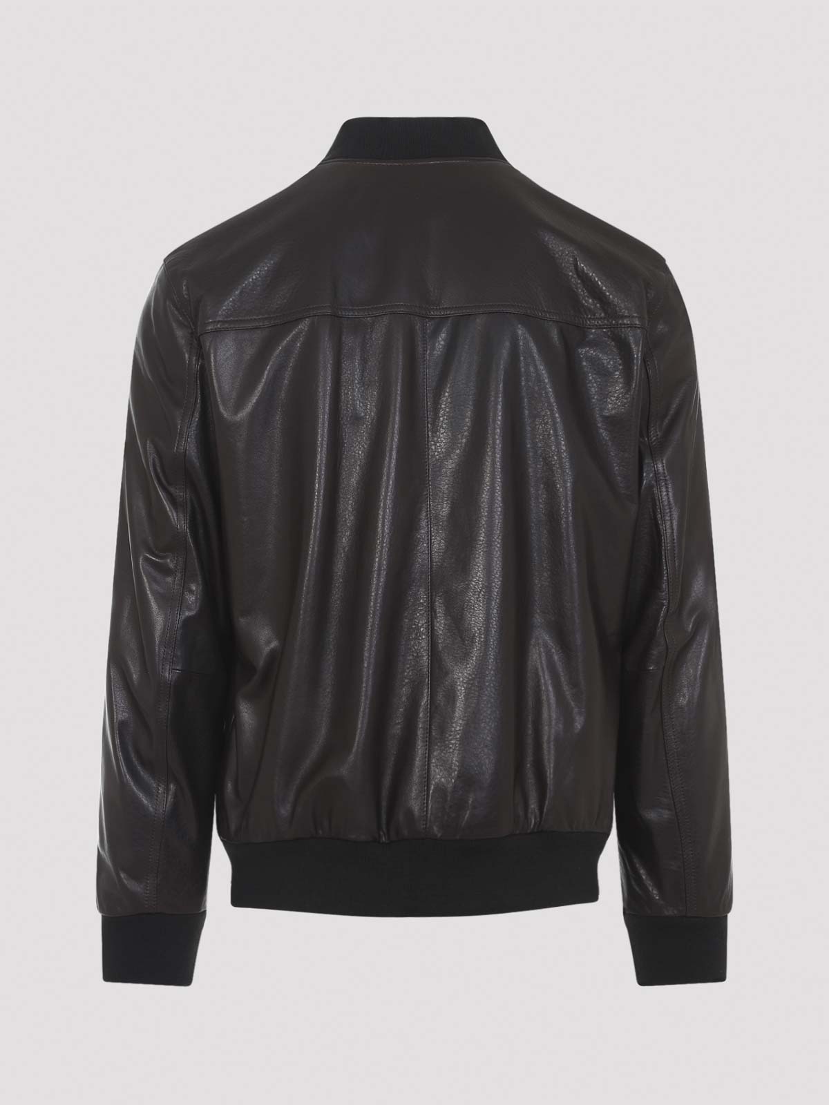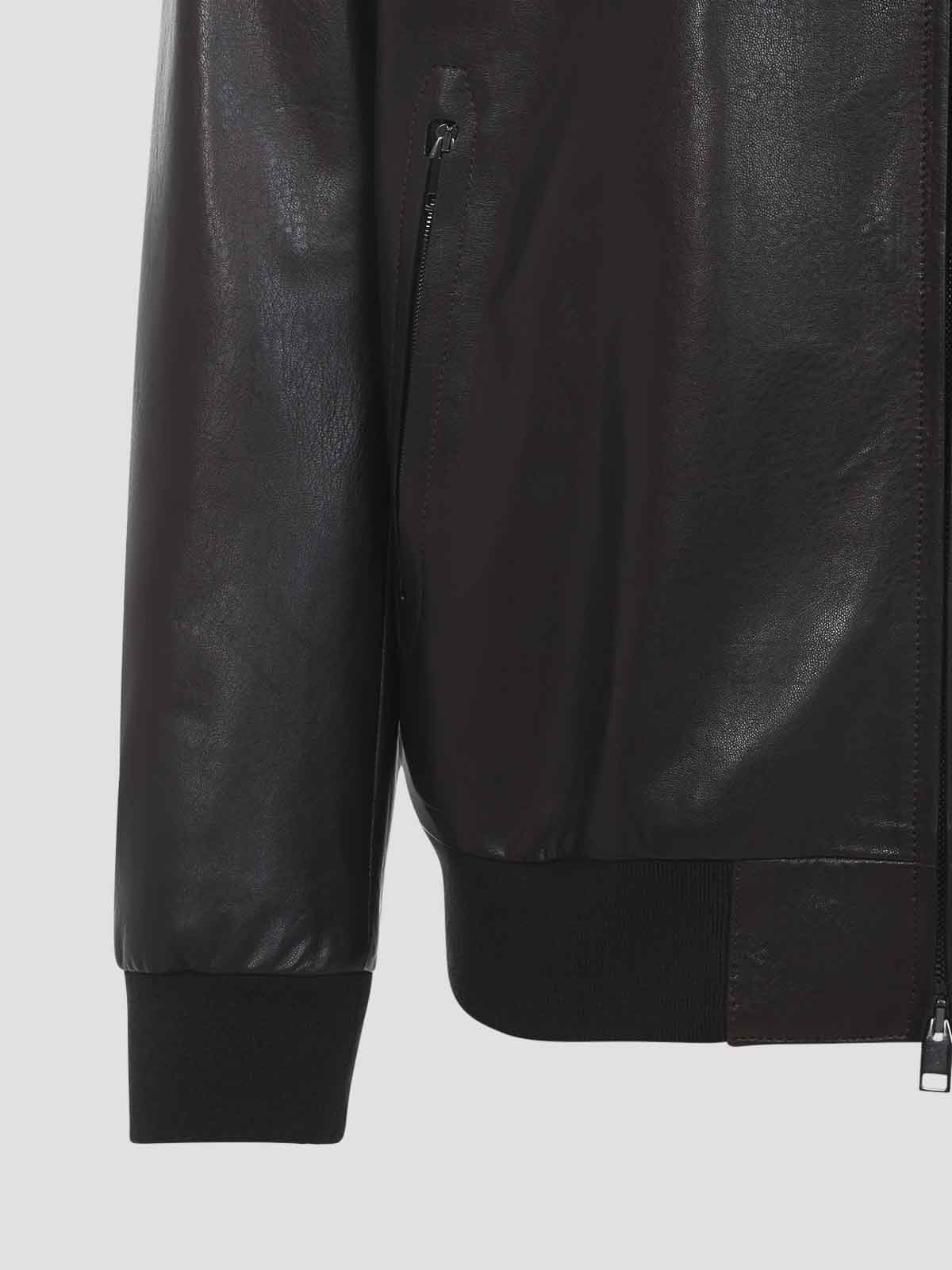 Brioni coffee brown leather bomber jacket. pure coffee brown leather jacket, stand-up ribbed collar, front zipped fastening, side zipped pockets, long sleeves, ribbed cuffs and hem, straight hem.