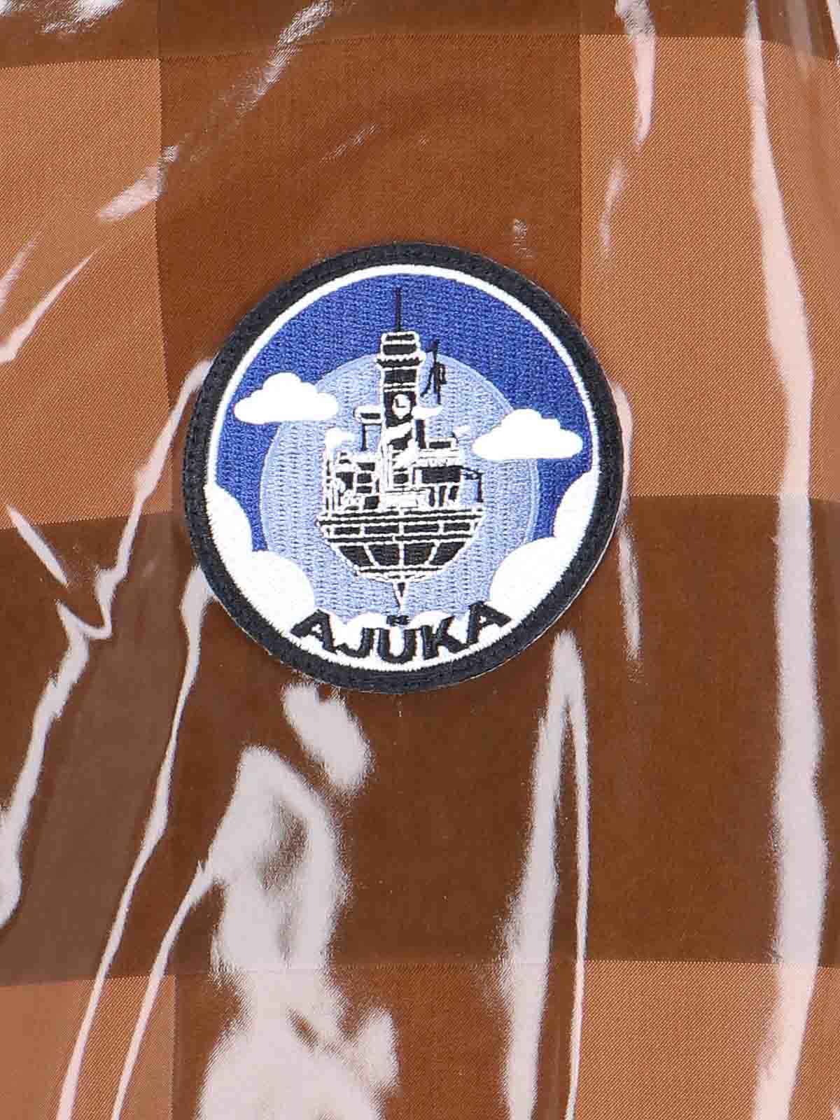 Brown checked varsity charles jeffrey loverboy bomber jacket tonal check shiny finish blue classic collar blue logo patch front and back striped knit finish straight hem