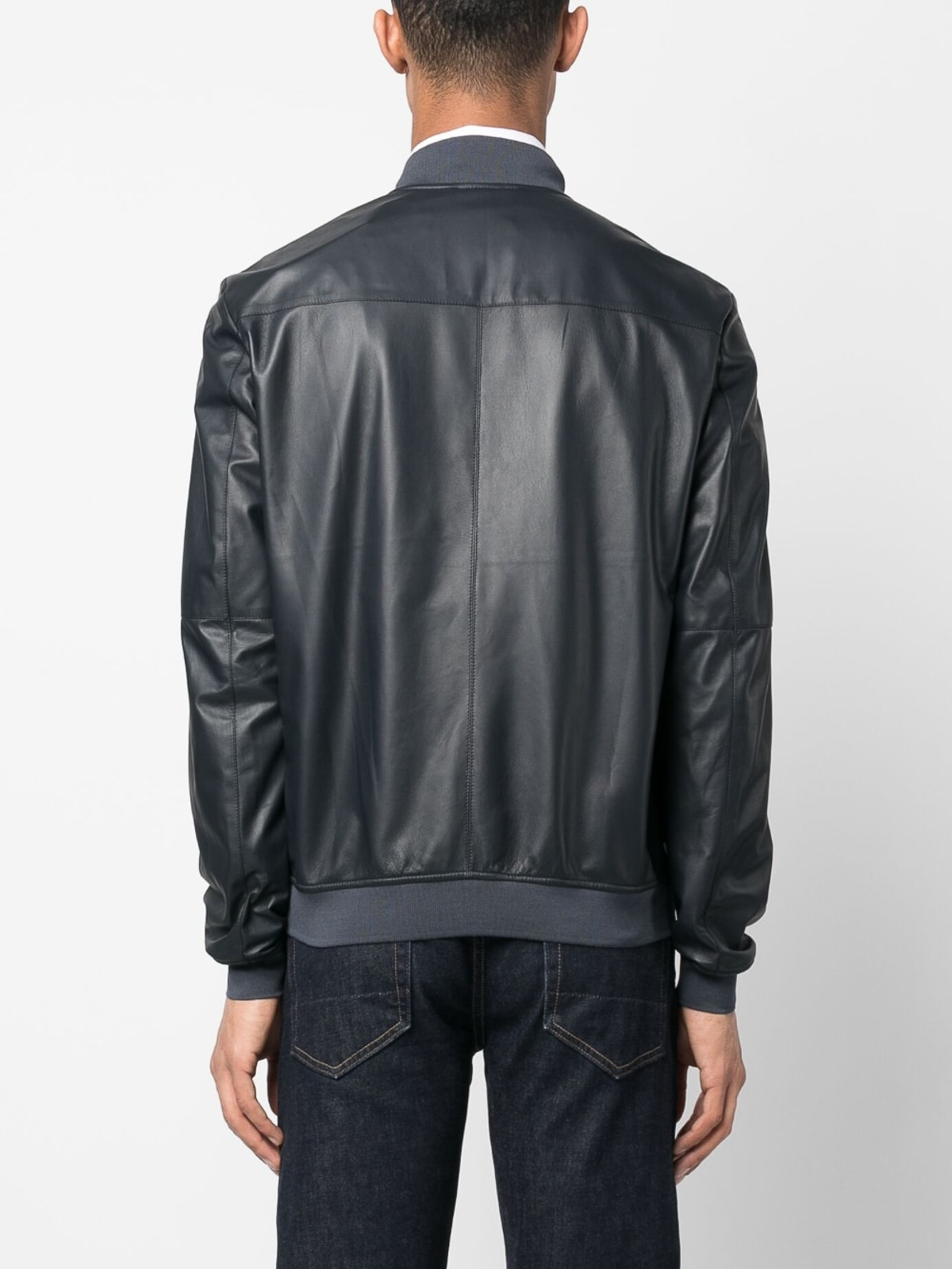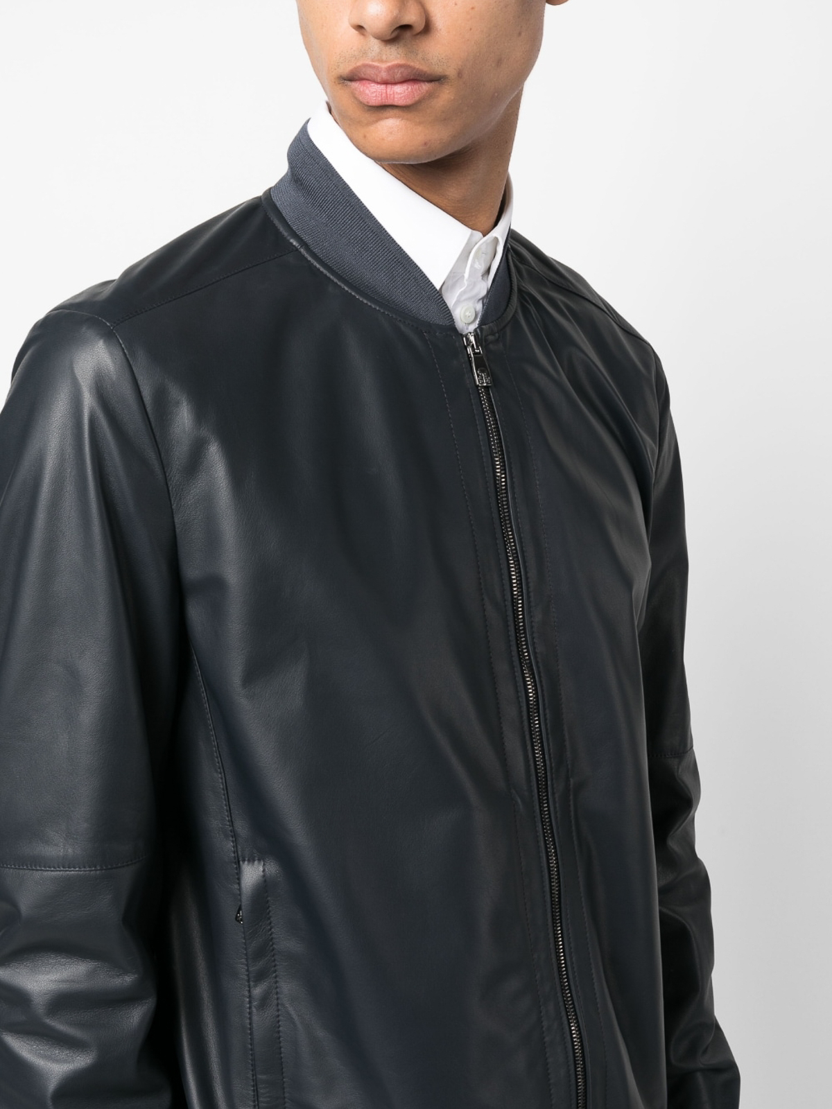 Leather bomber jacket from corneliani featuring navy blue lambskin cotton ribbed band collar front zip fastening long sleeves straight hem ribbed cuffs and hem and two side zip-fastening pockets size it