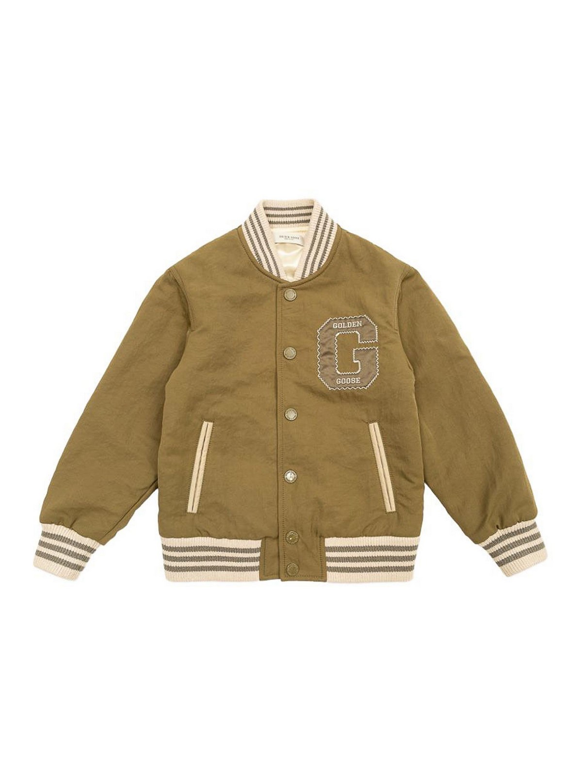 Bomber jacket with olive green feature patch with striped and ribbed patch with snap button placket welt pockets long sleeves