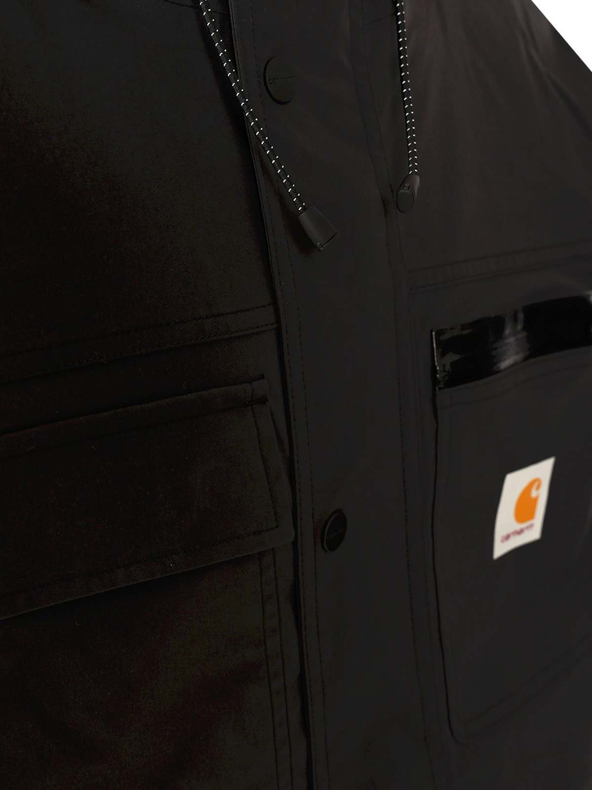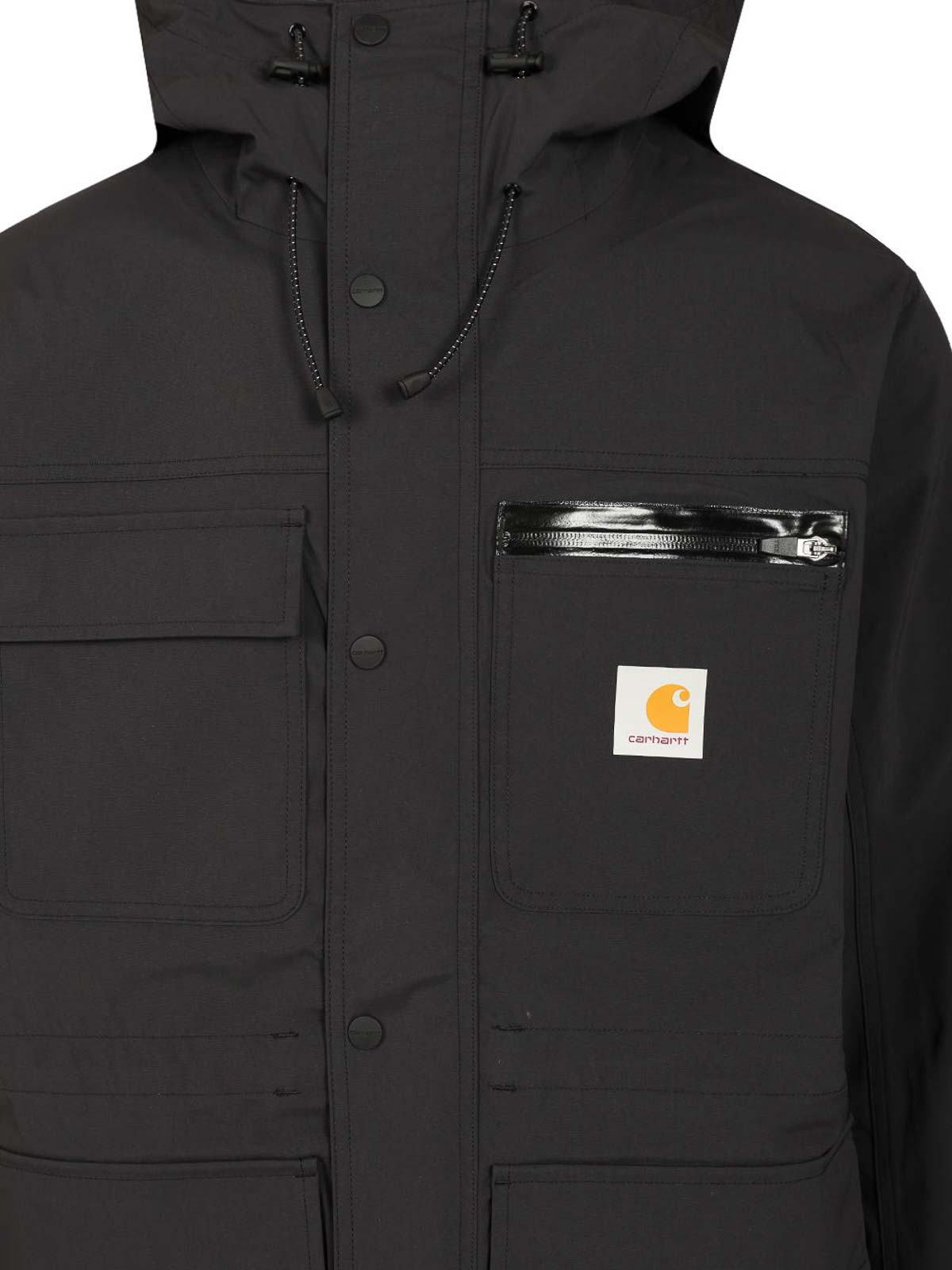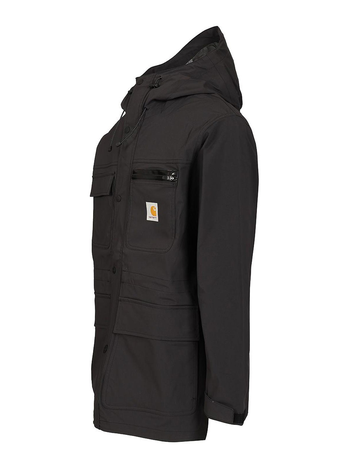 bowden jacket in waterproof stretch nylon by carhartt wip, with piping at the seams, adjustable hood, waist, hem and cuffs, four pockets on the front: two on the chest and two lower patch pockets, square woven label.