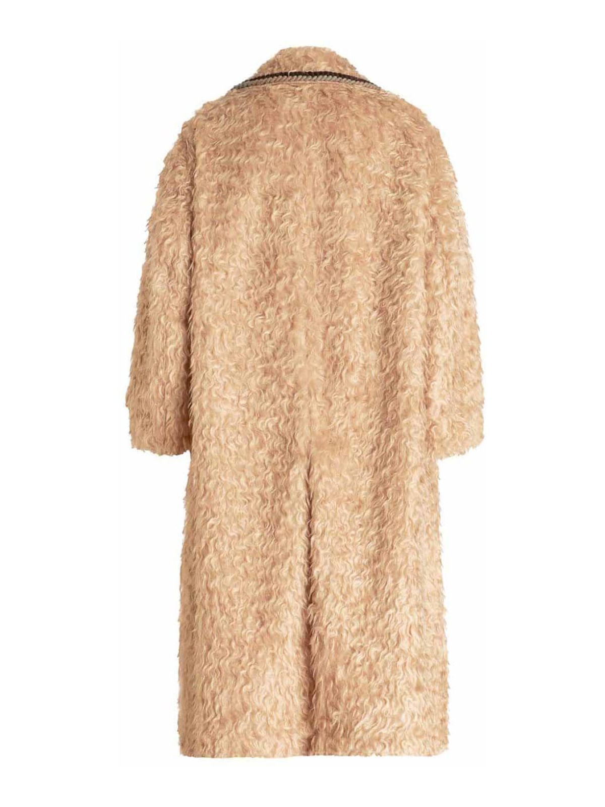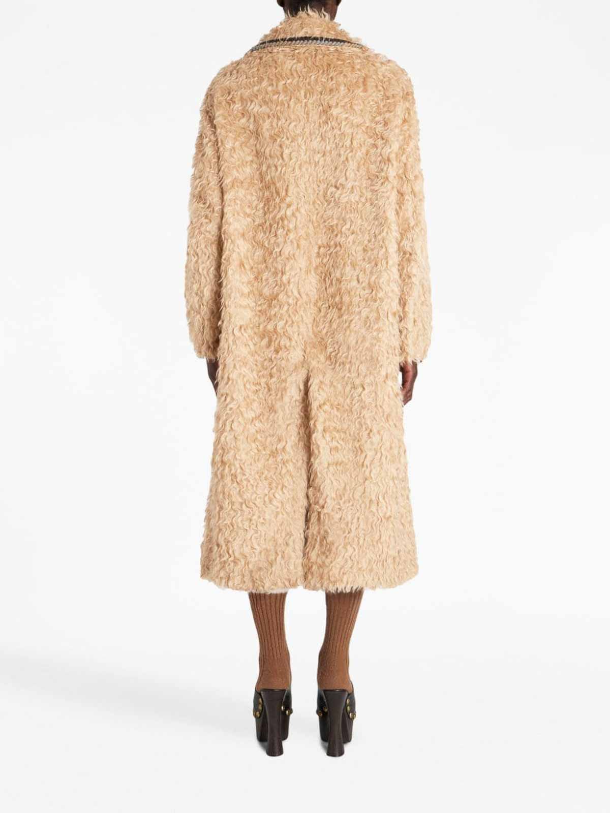 Braided-trim double-breasted coat from etro featuring faux-shearling design embossed gold-tone buttons braided edge rear slit double-breasted button two flap pockets mid-length sand beige classic lapels and long sleeves