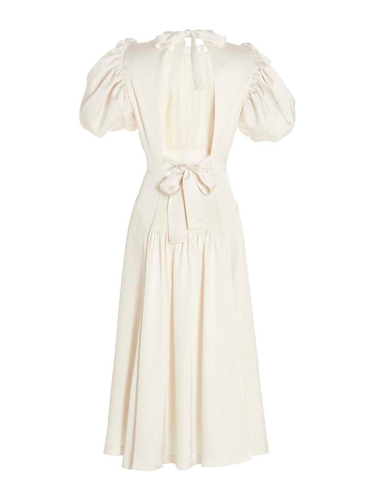 Crew neck dress with puff sleeves with shirred detail to emphasize the shoulder point, tight waist with front pleats and bows on the back, and lining. Bridal capsule.
