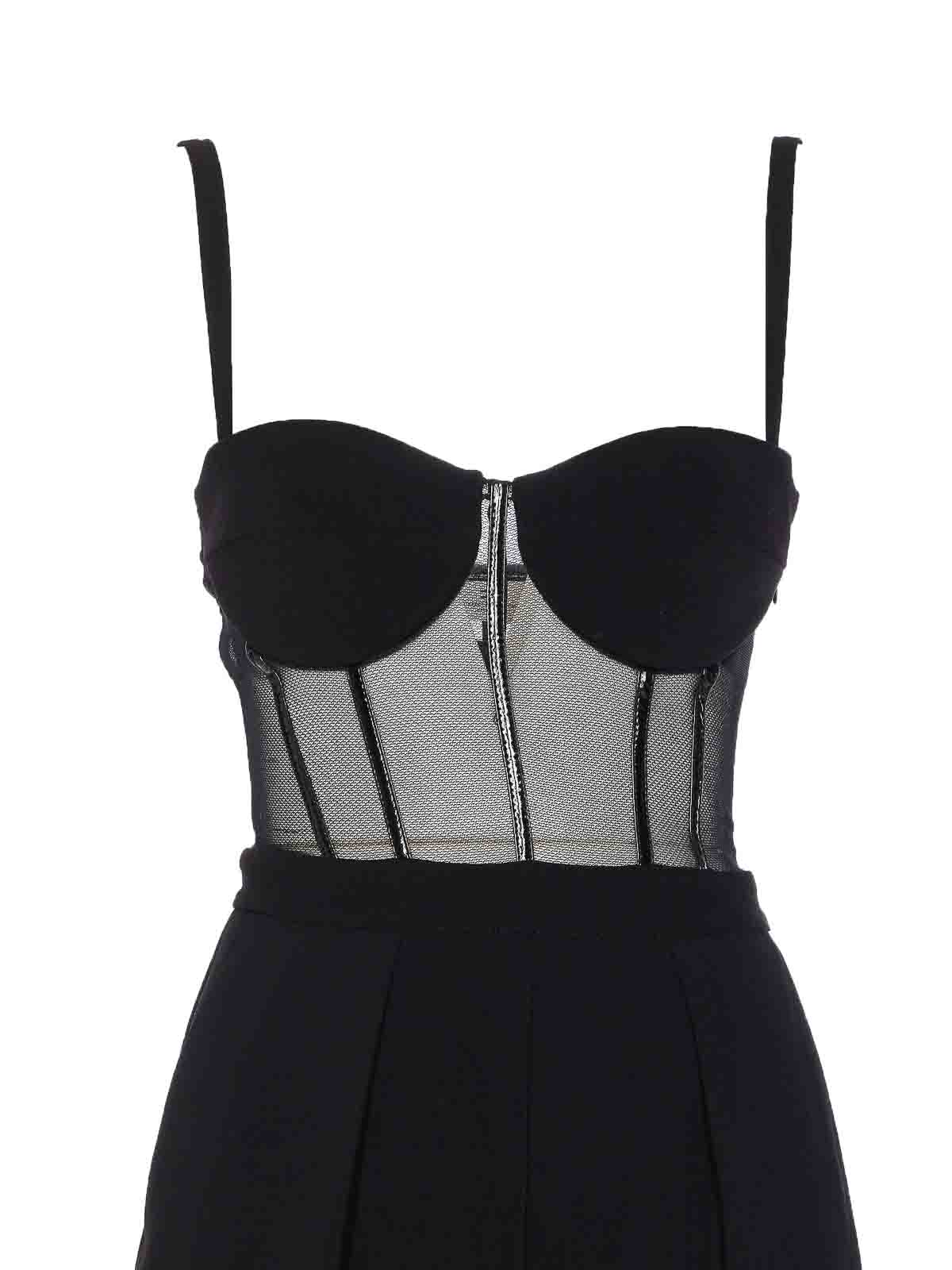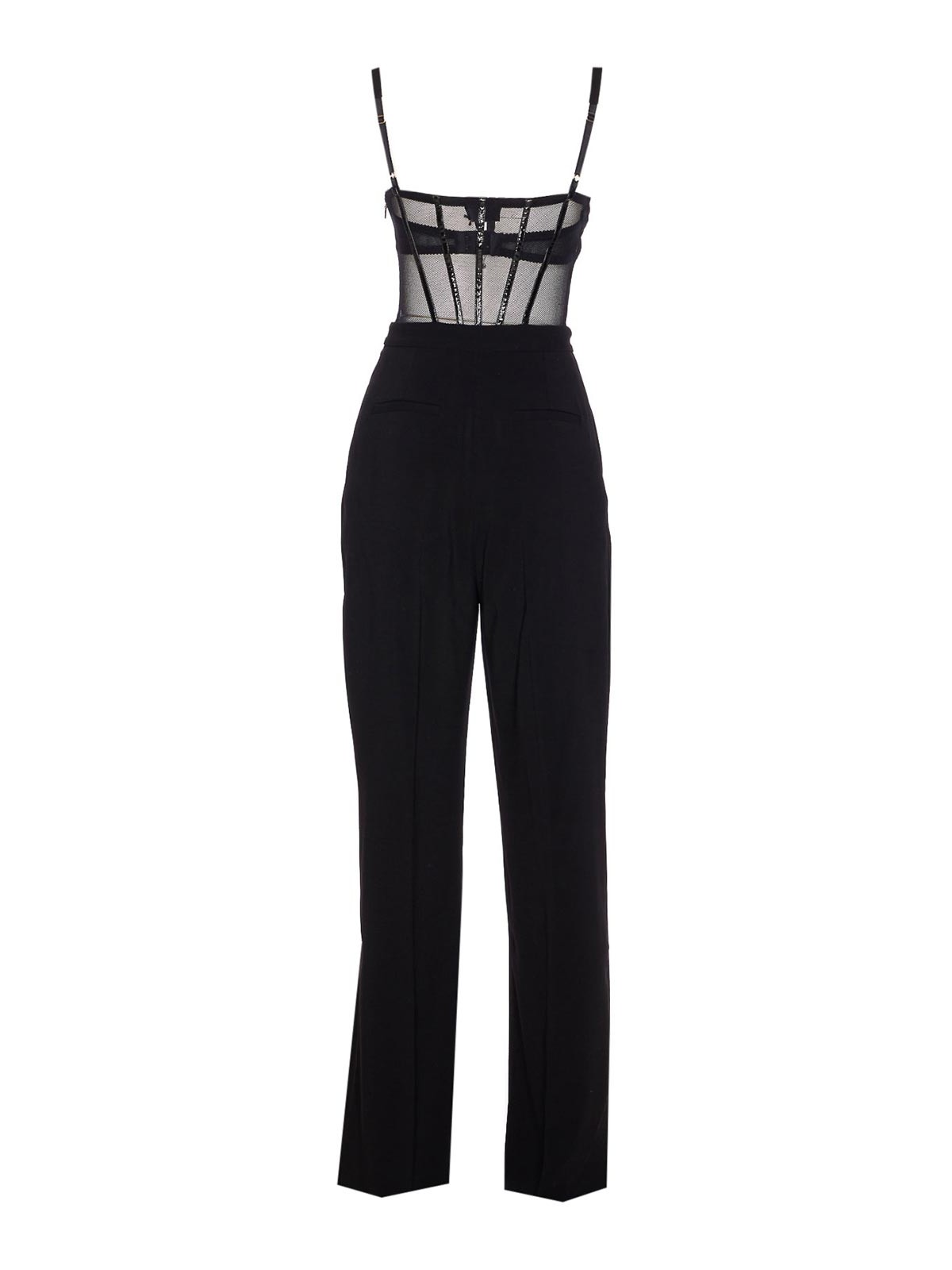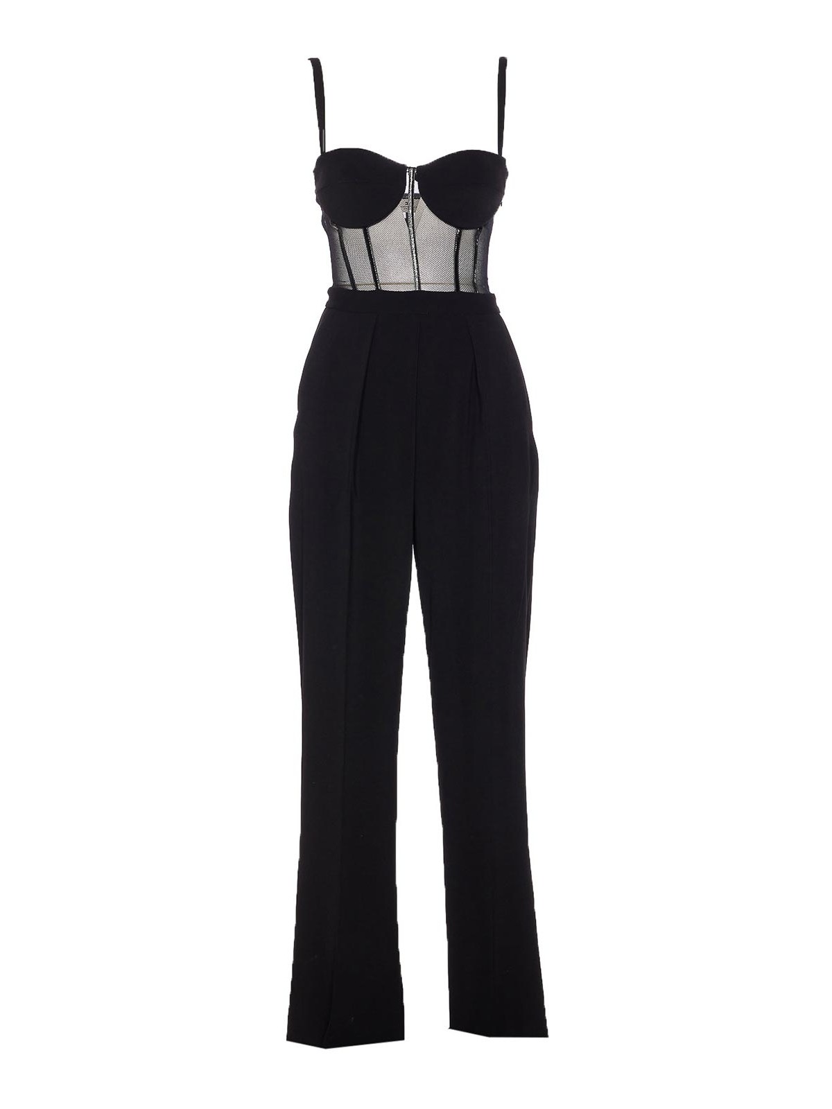 Elisabetta franchi black jumpsuit,back zip closure, bustier effect, trasparent effect, spaghetti straps, straight leg