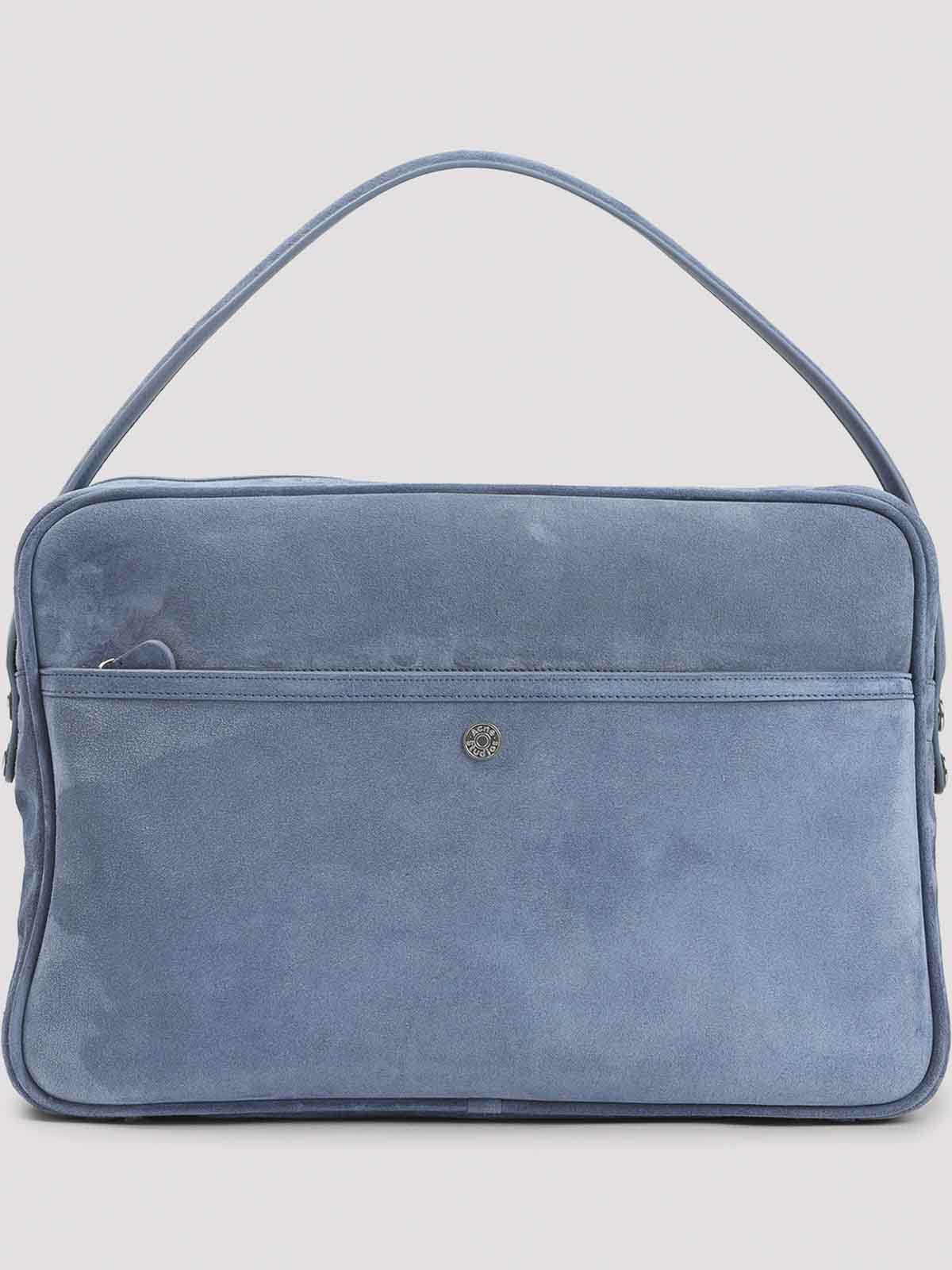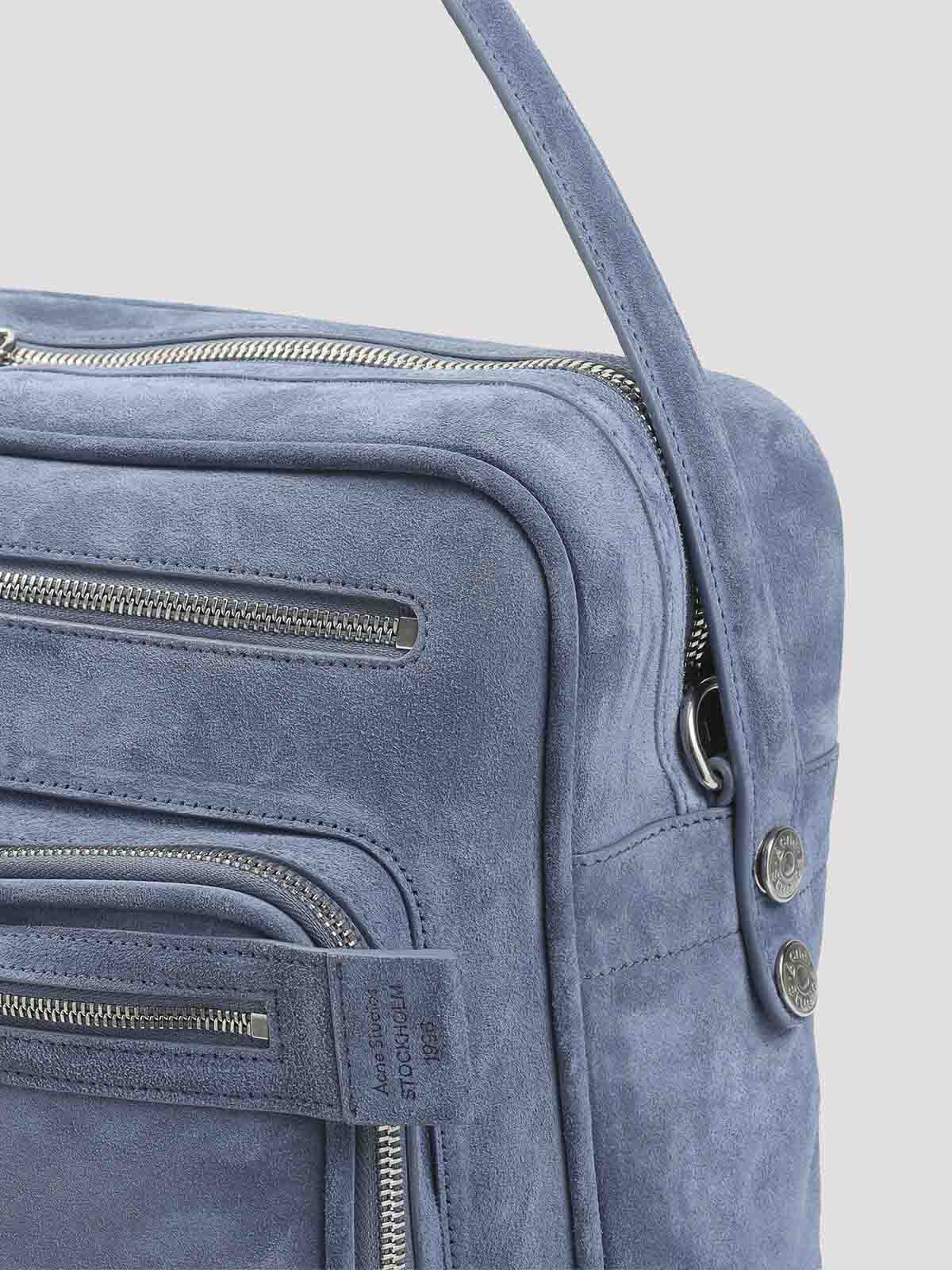 Acne studios denim blue calf leather camero camera suede bag. pure denim blue calf leather bag, top handle, top two-ways zipped fastening, front zipped pocket, front cargo pocket, side silver--tone metallic key design, adjustable and detachable shoulder strap, one main compartment. silver-tone hardware.