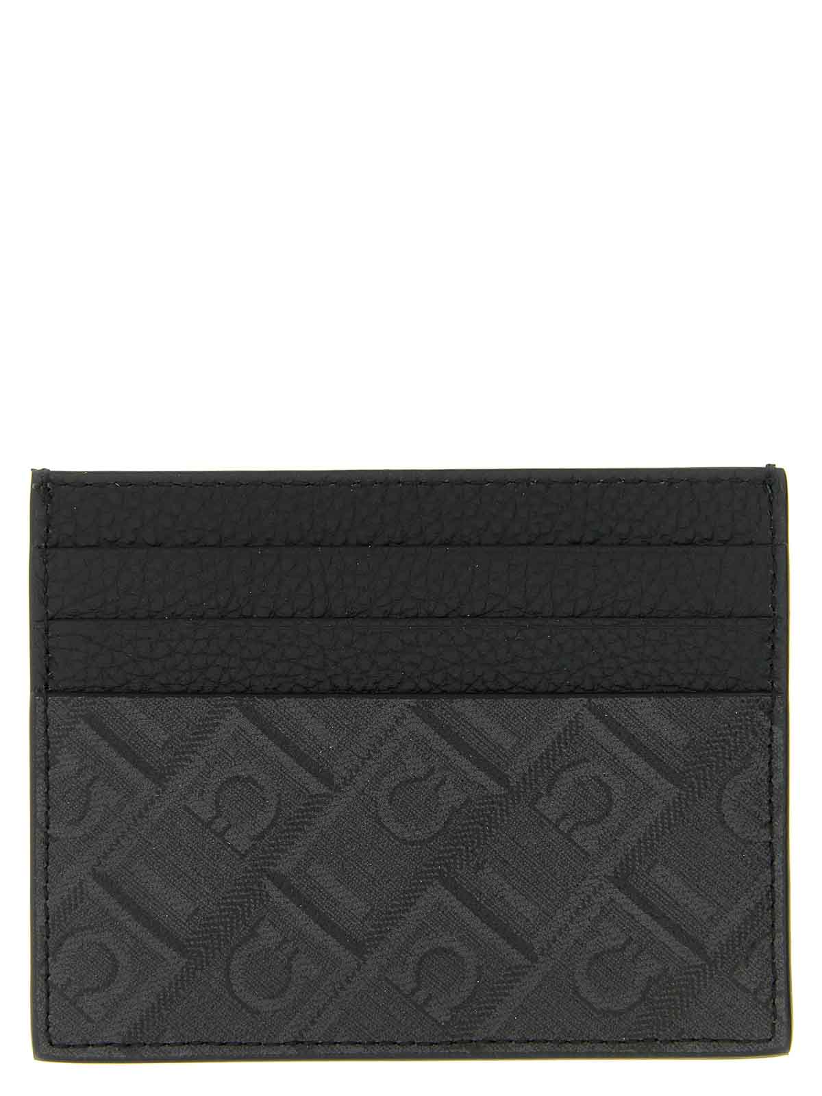Hammered calf leather card holder with outer panels in coated fabric with tone-on-tone 'ferragamo monogram' print, and embossed logo on the front.