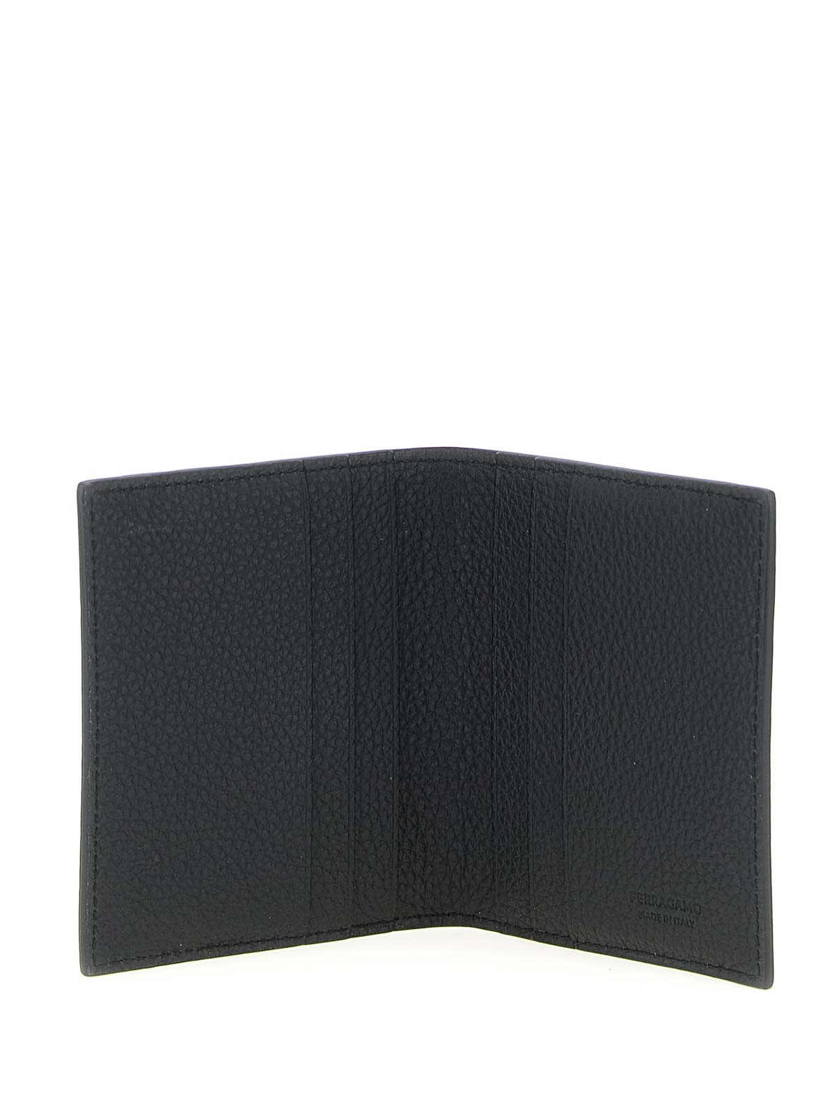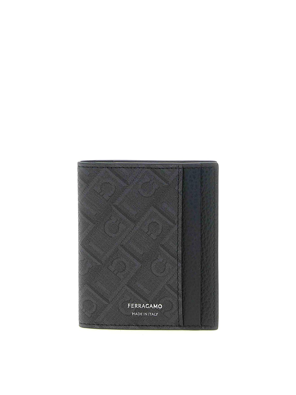 Card holder with hammered calf leather interior and external dials in coated fabric with 'ferragamo monogram' print, front logo print, and book opening.