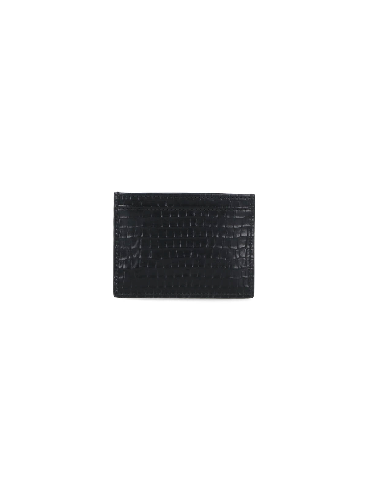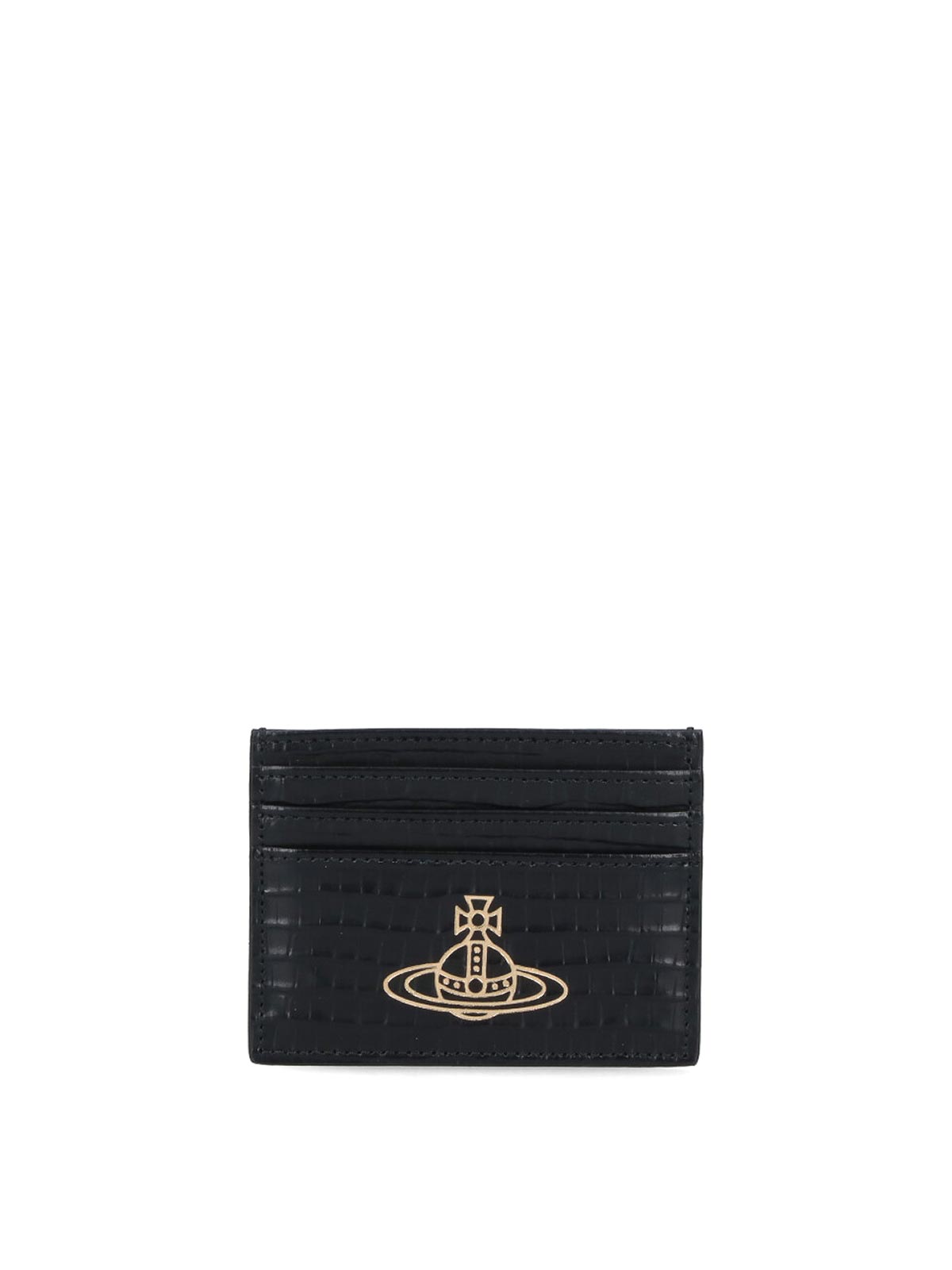 Vivienne Westwood orb card holder, in black calfskin, crocodile print, front golden metal logo, one flat top pocket, six card slots.