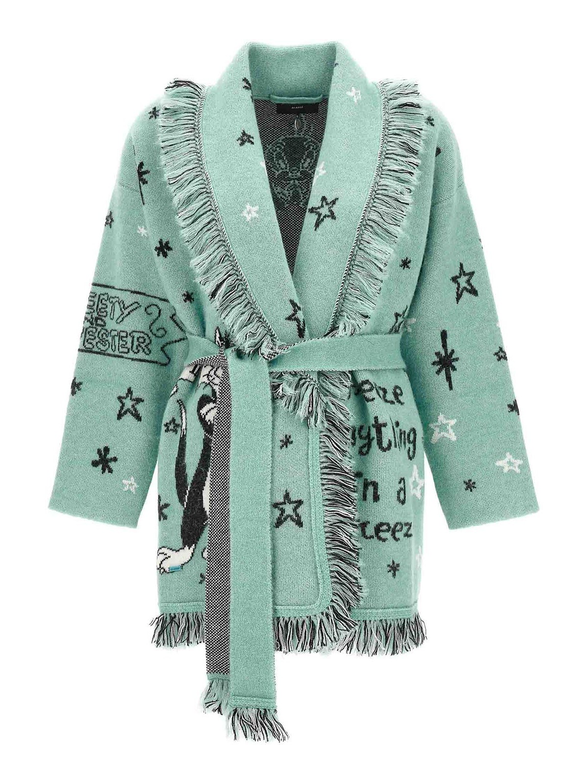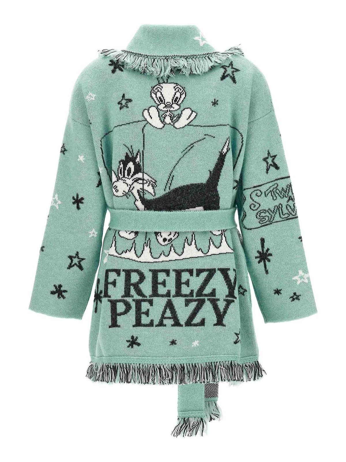Alanui x looney tunes freexy peazy blend cardigan with all-over jacquard pattern v-neck long sleeves belted at the waist and fringed on the edging