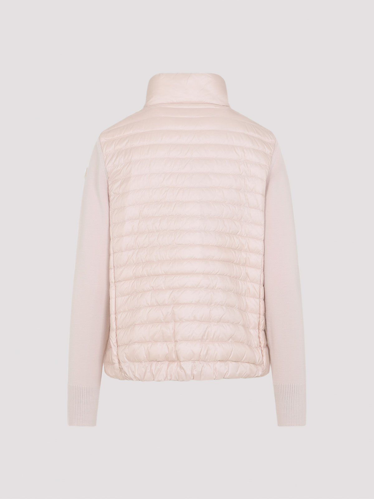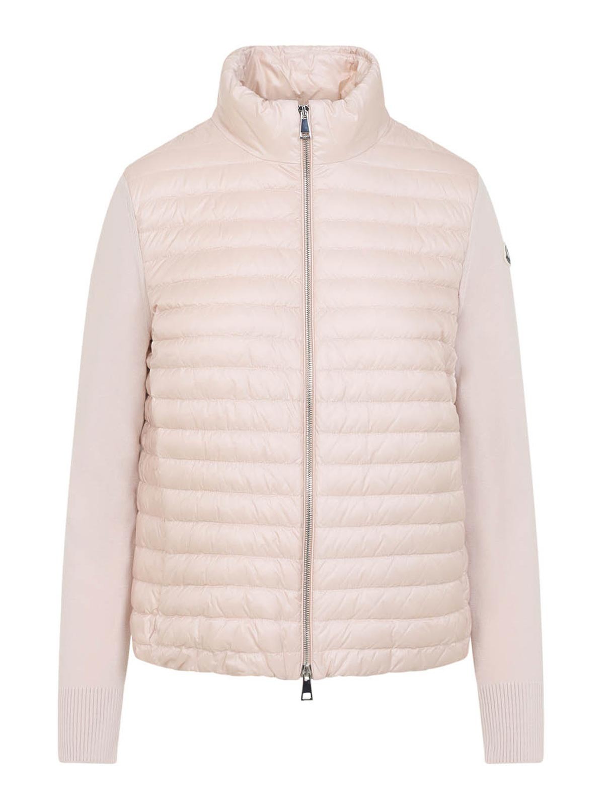 Moncler light pink cardigan. pure light pink polyamide cardigan jacket, stand-up collar, front zipped fastening, side pockets, long knitted sleeves, signature patch logo on the right sleeve, ribbed cuffs, straight hem, padded design.