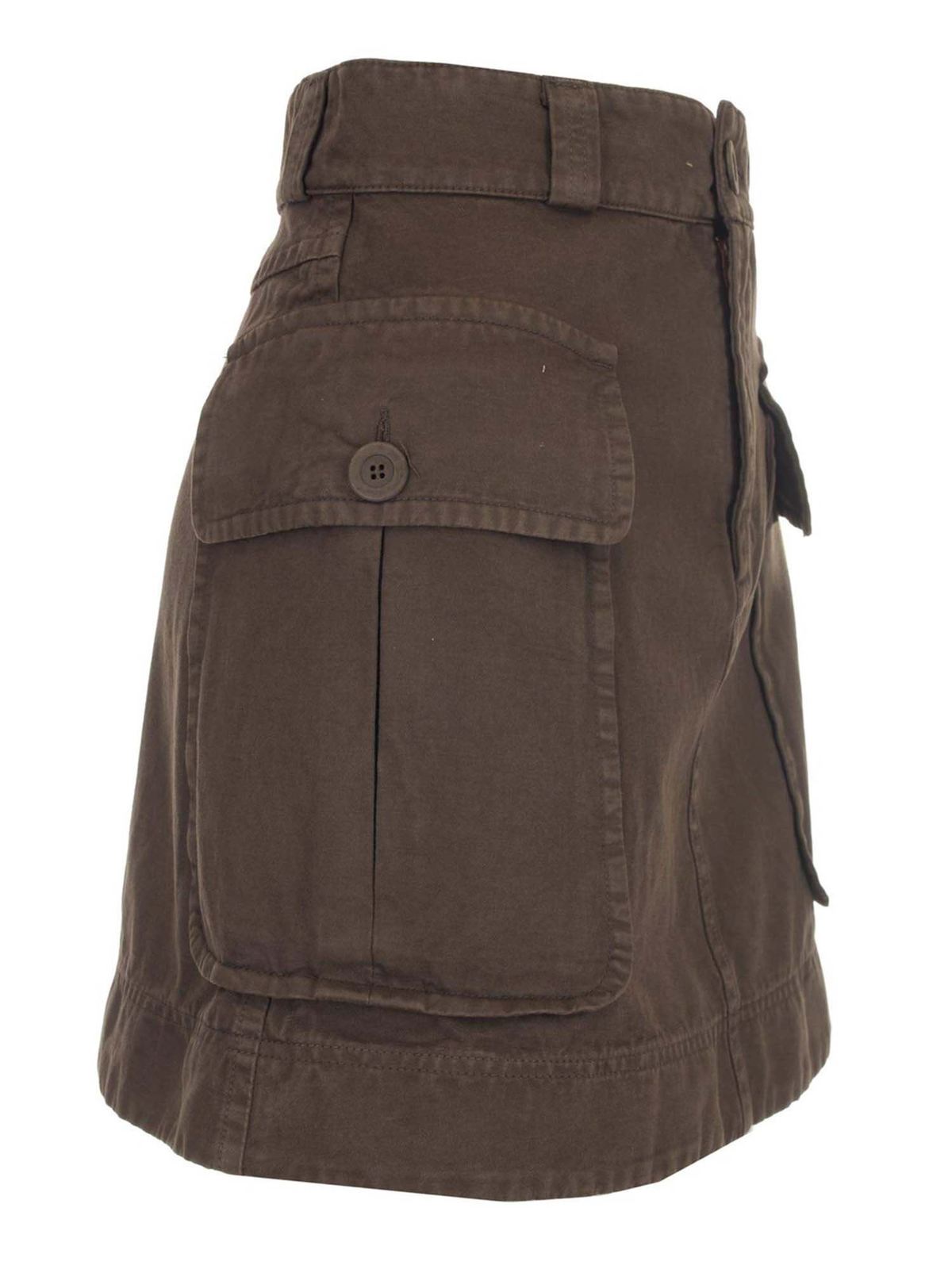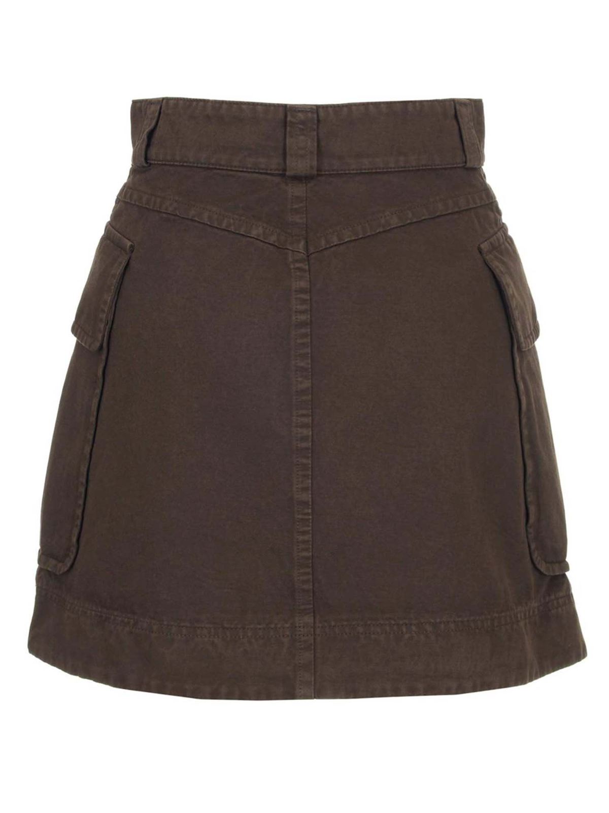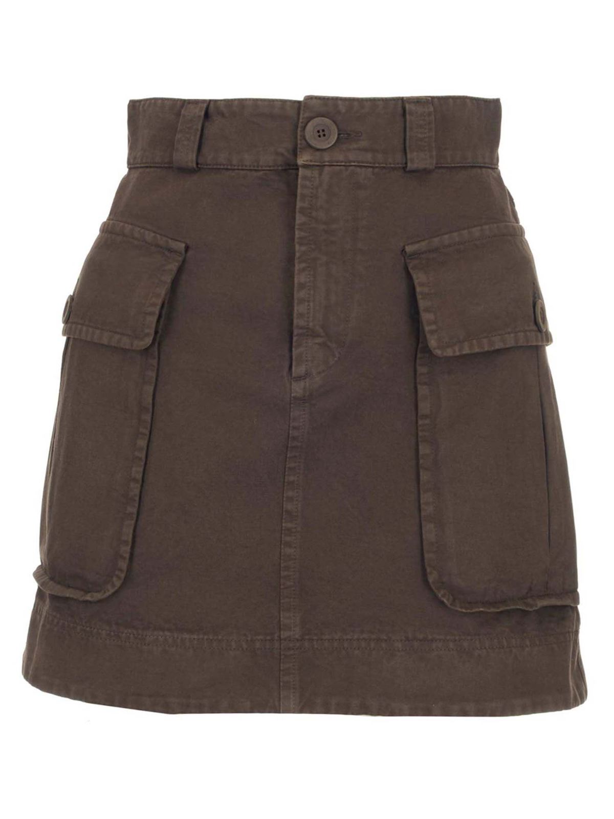 Cotton denim skirt Color: brown High waist Belt loops Maxi side cargo pockets Front zip and button fastening
