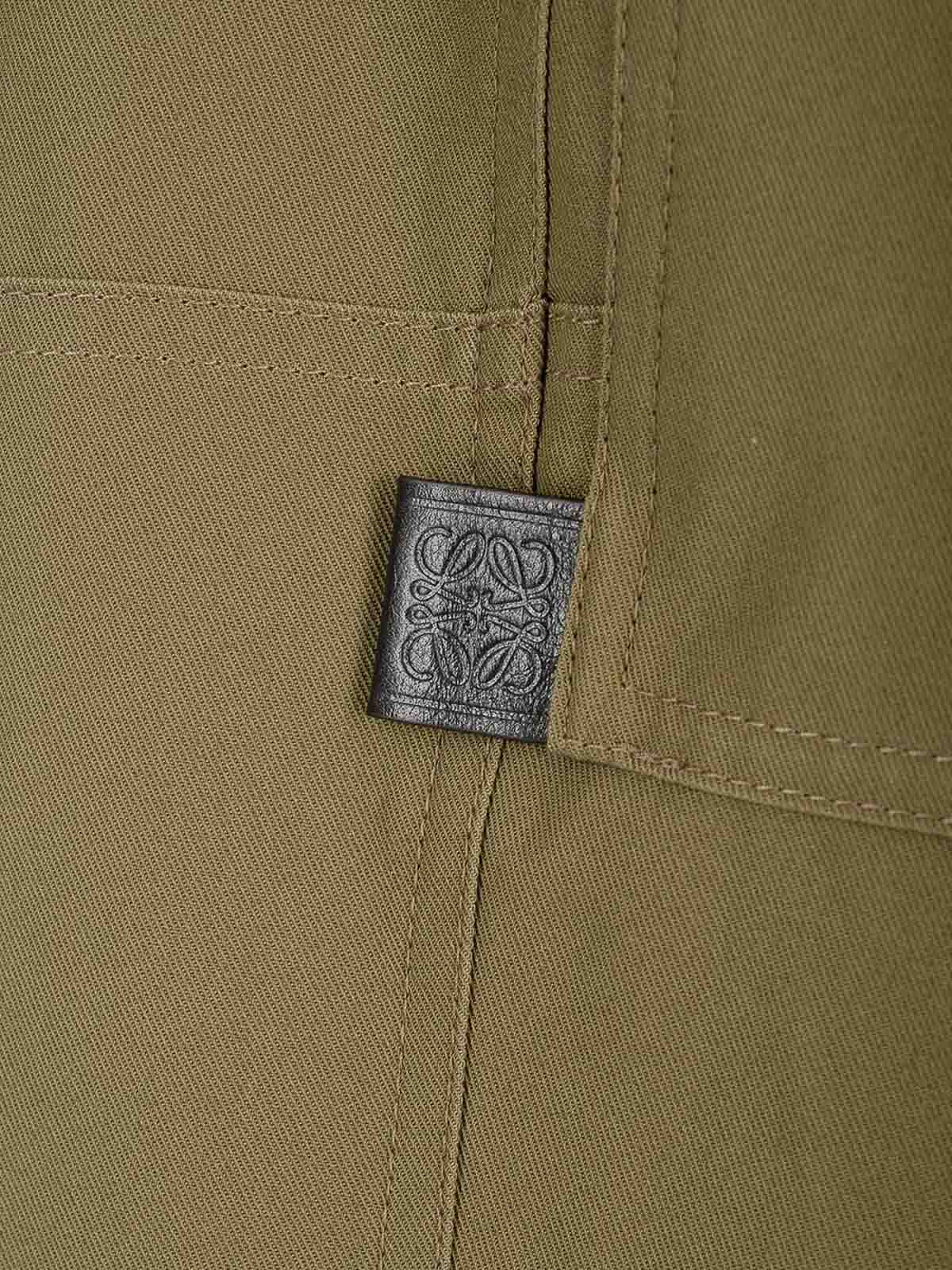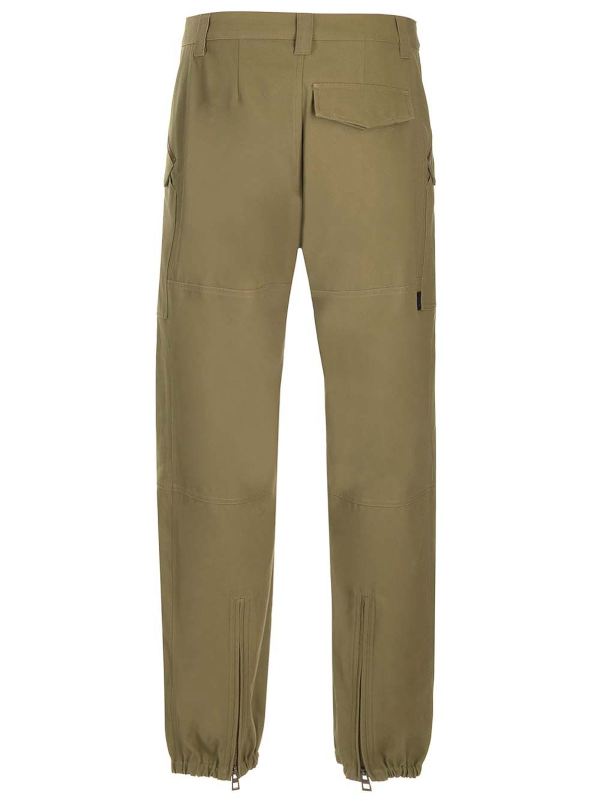 Cargo trousers in tea green medium weight cotton gabardine. with relaxed fit, medium waist, wide leg pockets, hidden zip closure, elasticated leg bottom with zip.