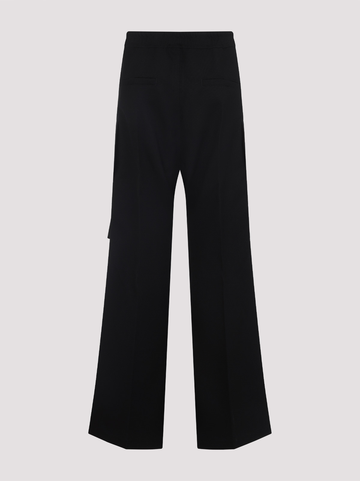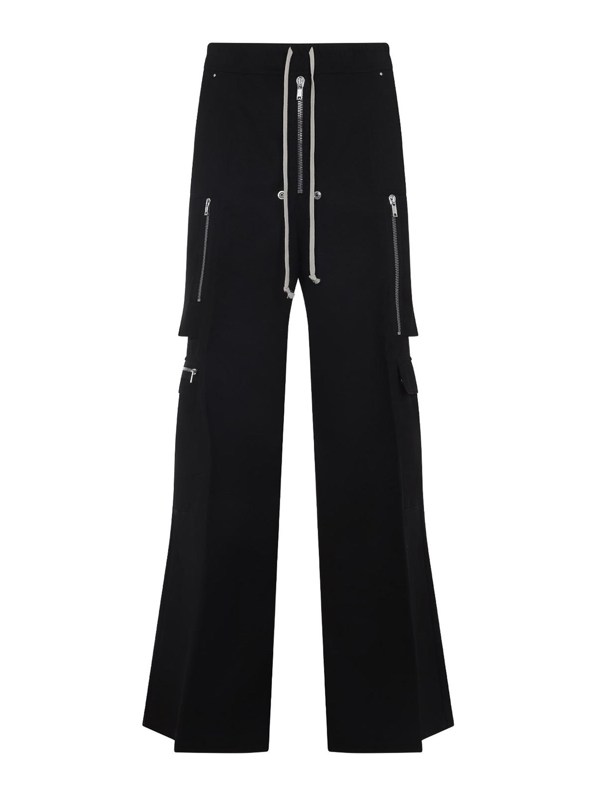 Rick owens black wool cargobelas pants. pure black wool pants, elastic waistband, front contrasting white drawstring details, front zipped fastening, back slit pockets, side zipped cargo pockets, wide leg, straight hem.