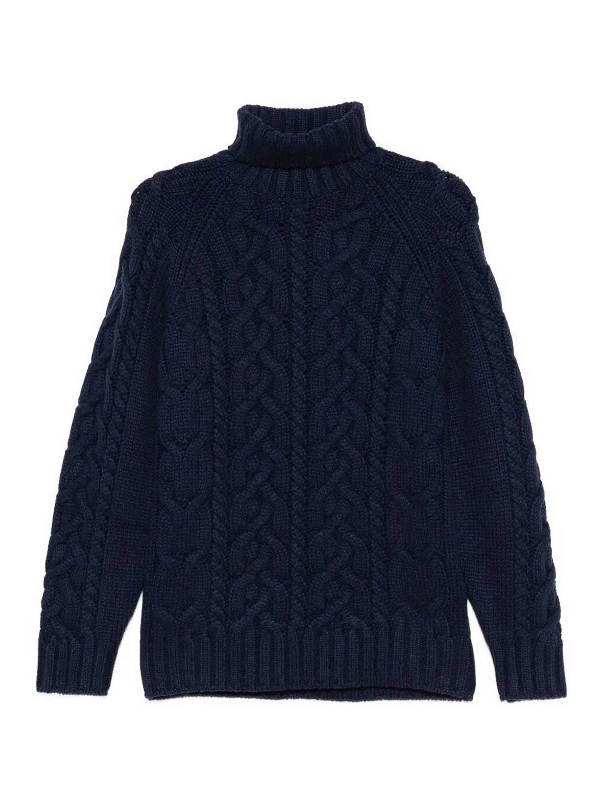 Navy blue cable-knit turtleneck, long sleeves, ribbed cuffs, ribbed hem