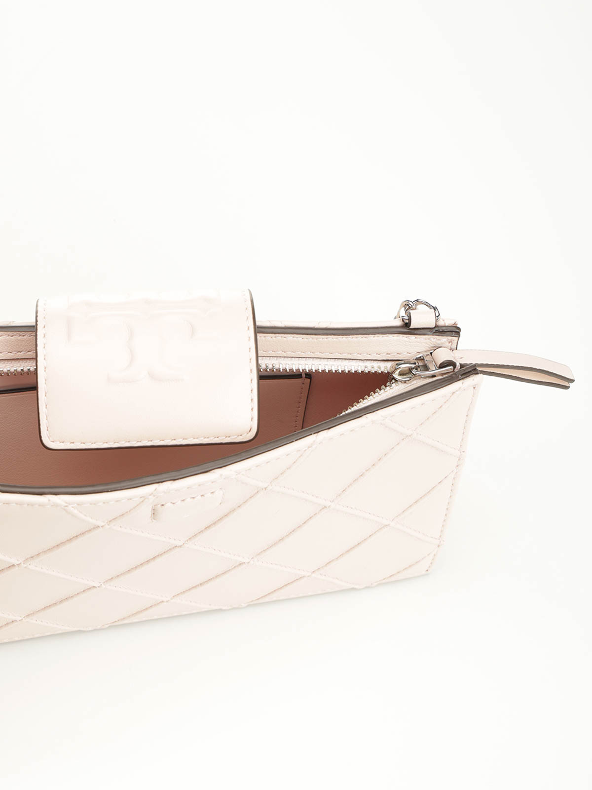 Tory burch's fleming chain wallet in soft leather, with space for cards, phone and tickets, quilted workmanship and a chain shoulder strap interwoven with the leather.