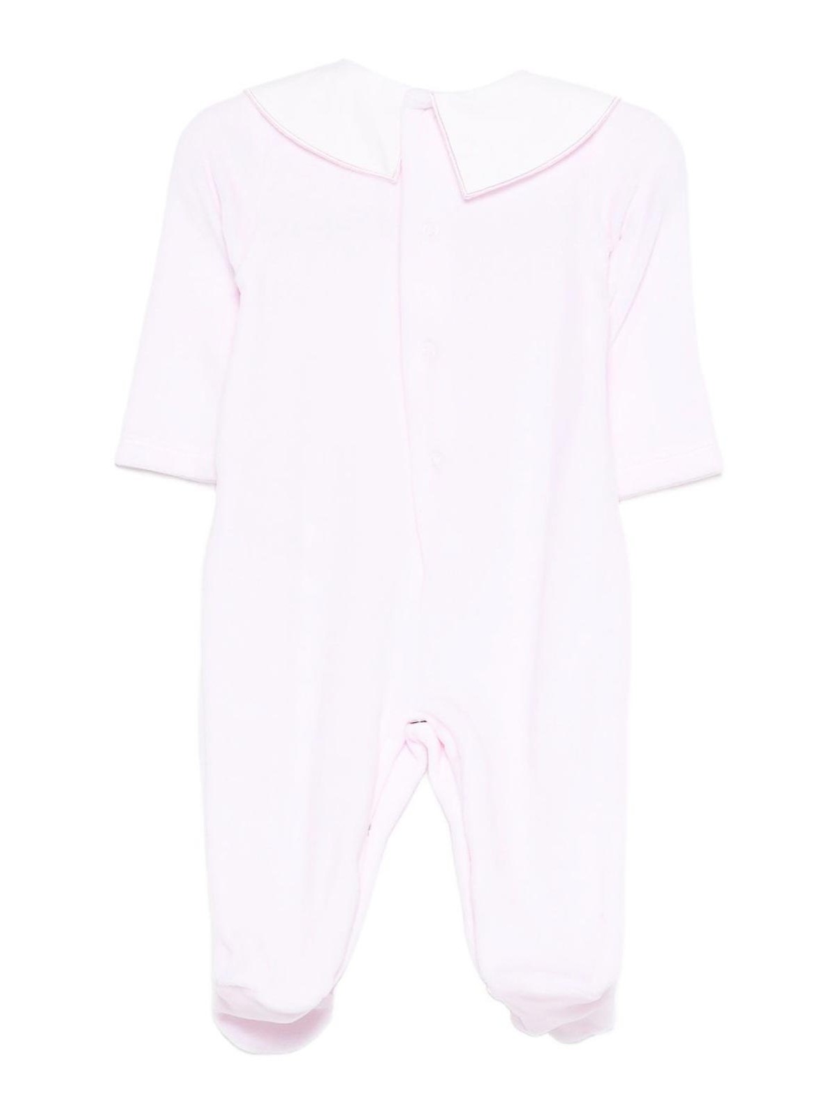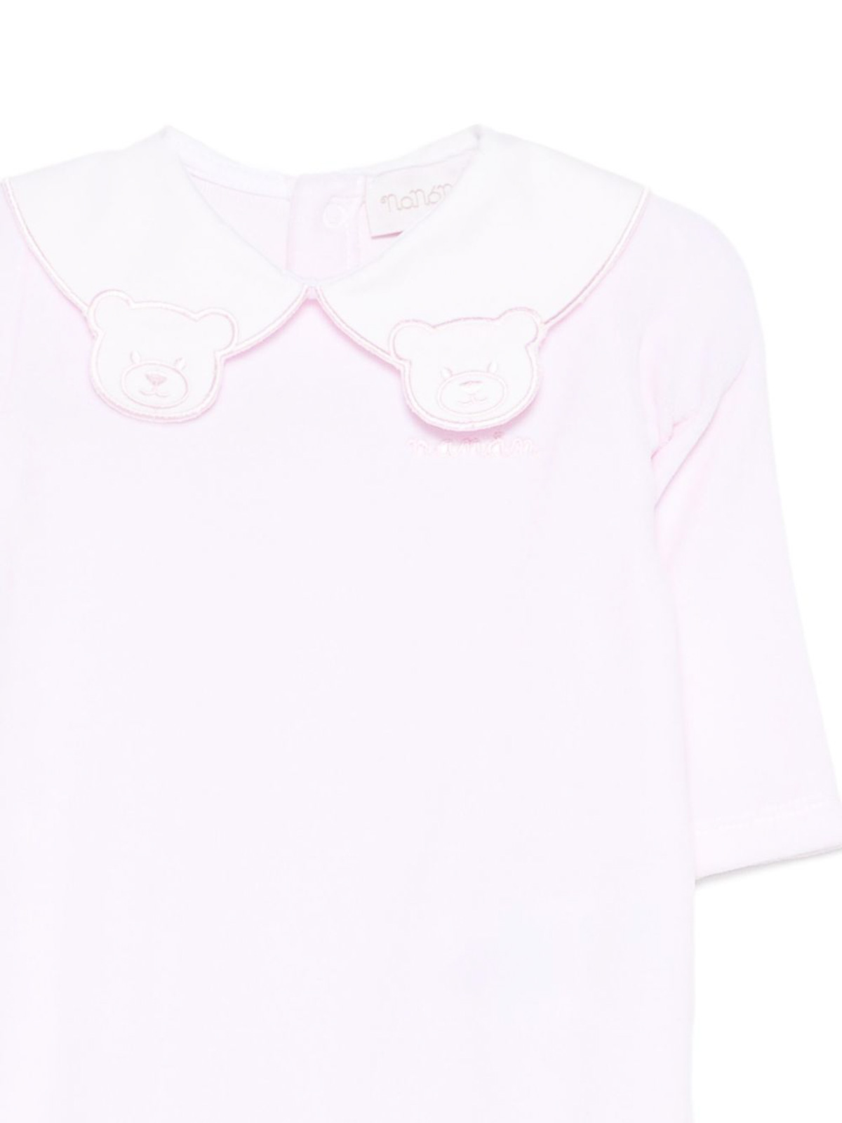 Newborn chenille onesie with white collar and teddy bear trim with buttons on the back and between the legs