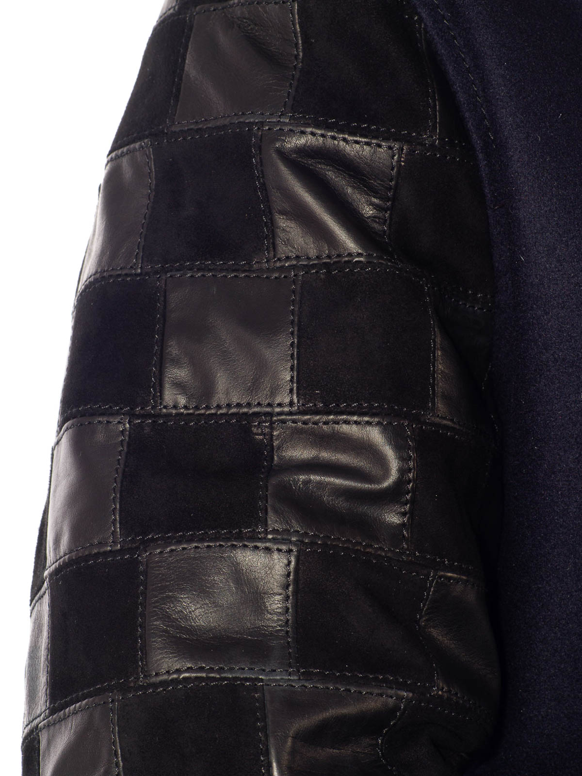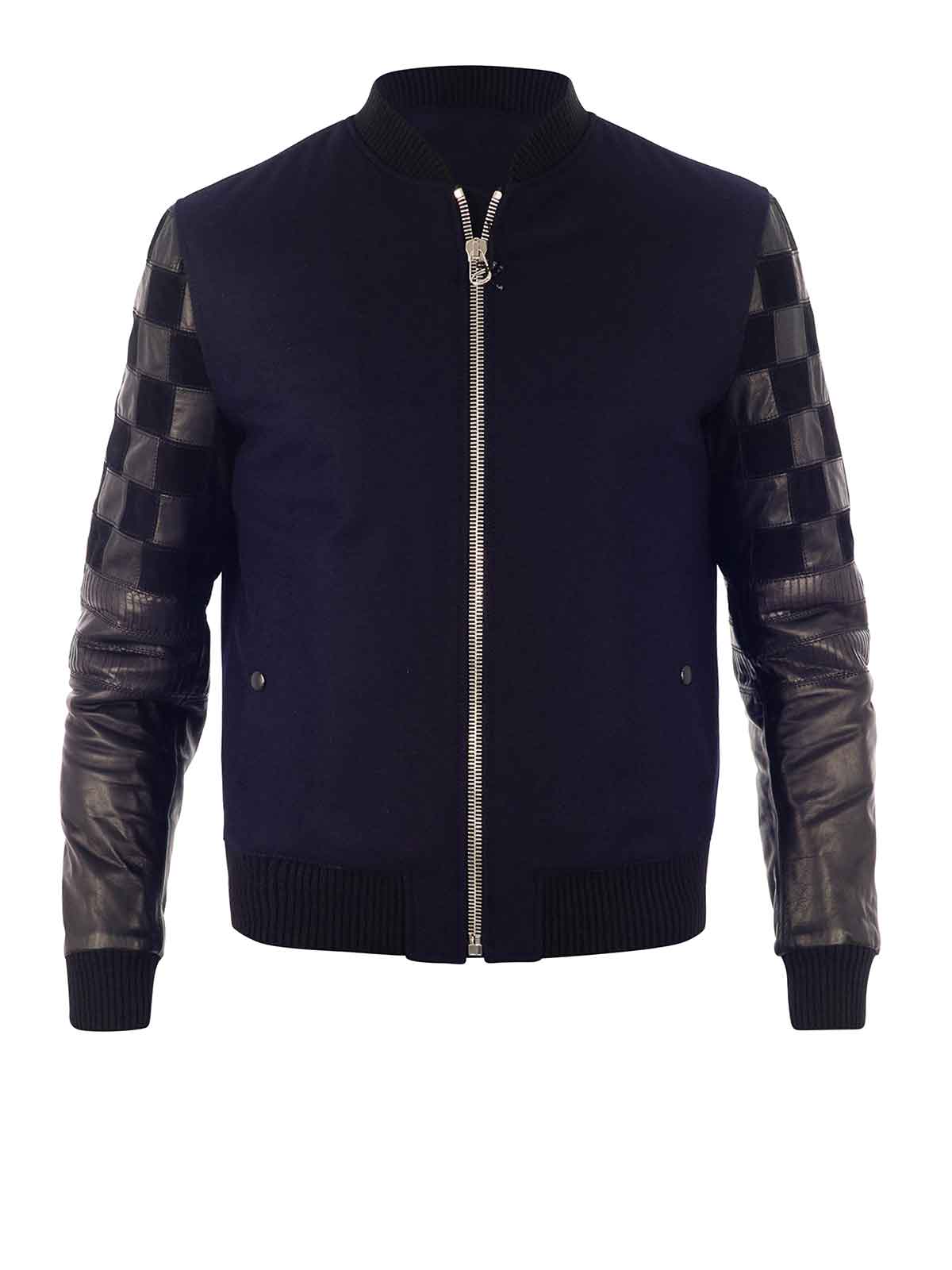 Wool and leather bomber jacket detailed with double fabric chessboard pattern, front zip fastening, two snap pockets, rib-knitted edges