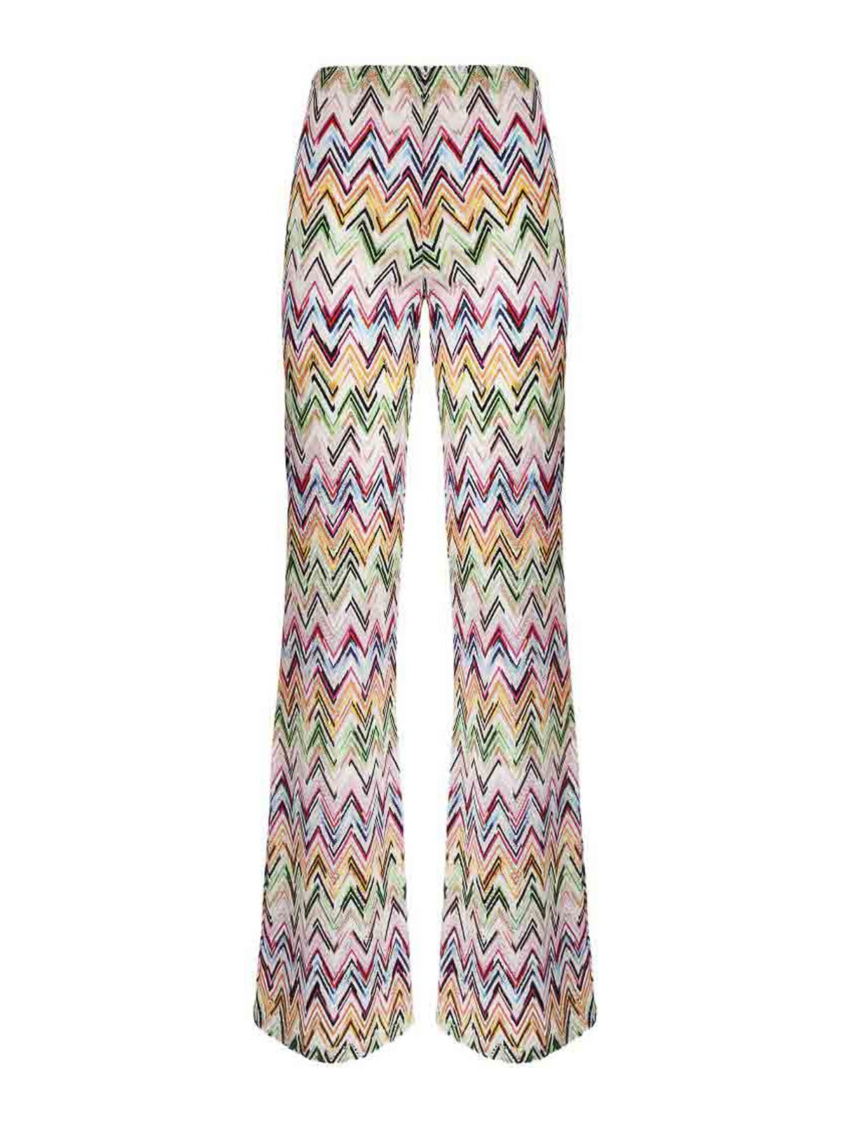 Pink-green-multicolor chevron-pattern trousers by missoni, made in italy with iconic artisanal craftsmanship. featuring a chevron motif and flared legs, each piece may slightly differ from the image, highlighting missonis unique handmade process. perfect for contemporary and refined looks.