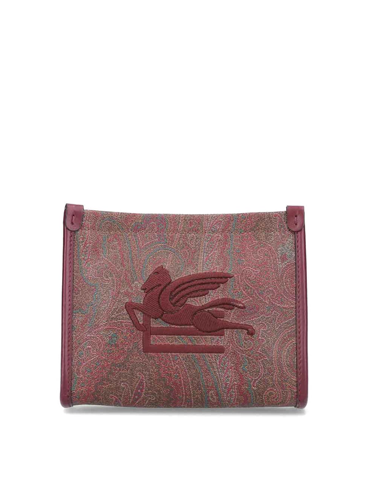 Small etro paisley pouch in red paisley jacquard in burgundy tone tone-on-tone embroidered logo trim side zip strap one internal flat pocket one main compartment