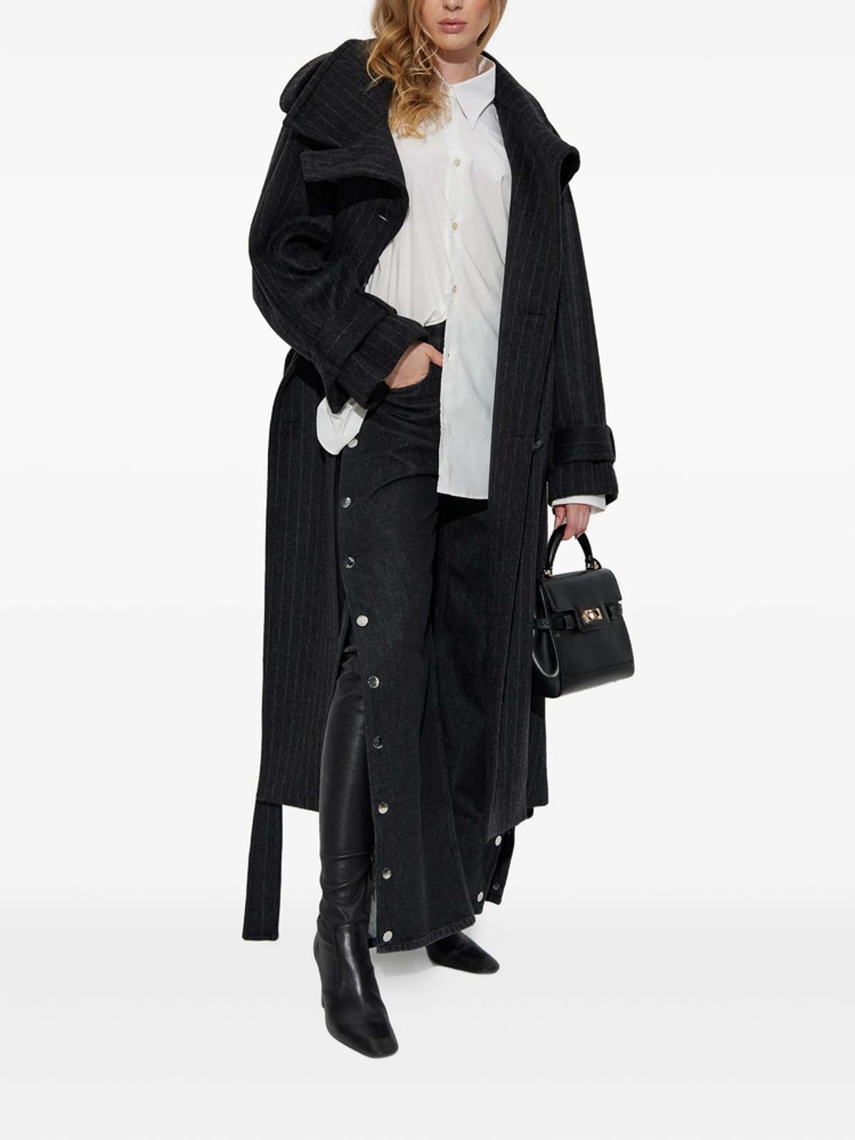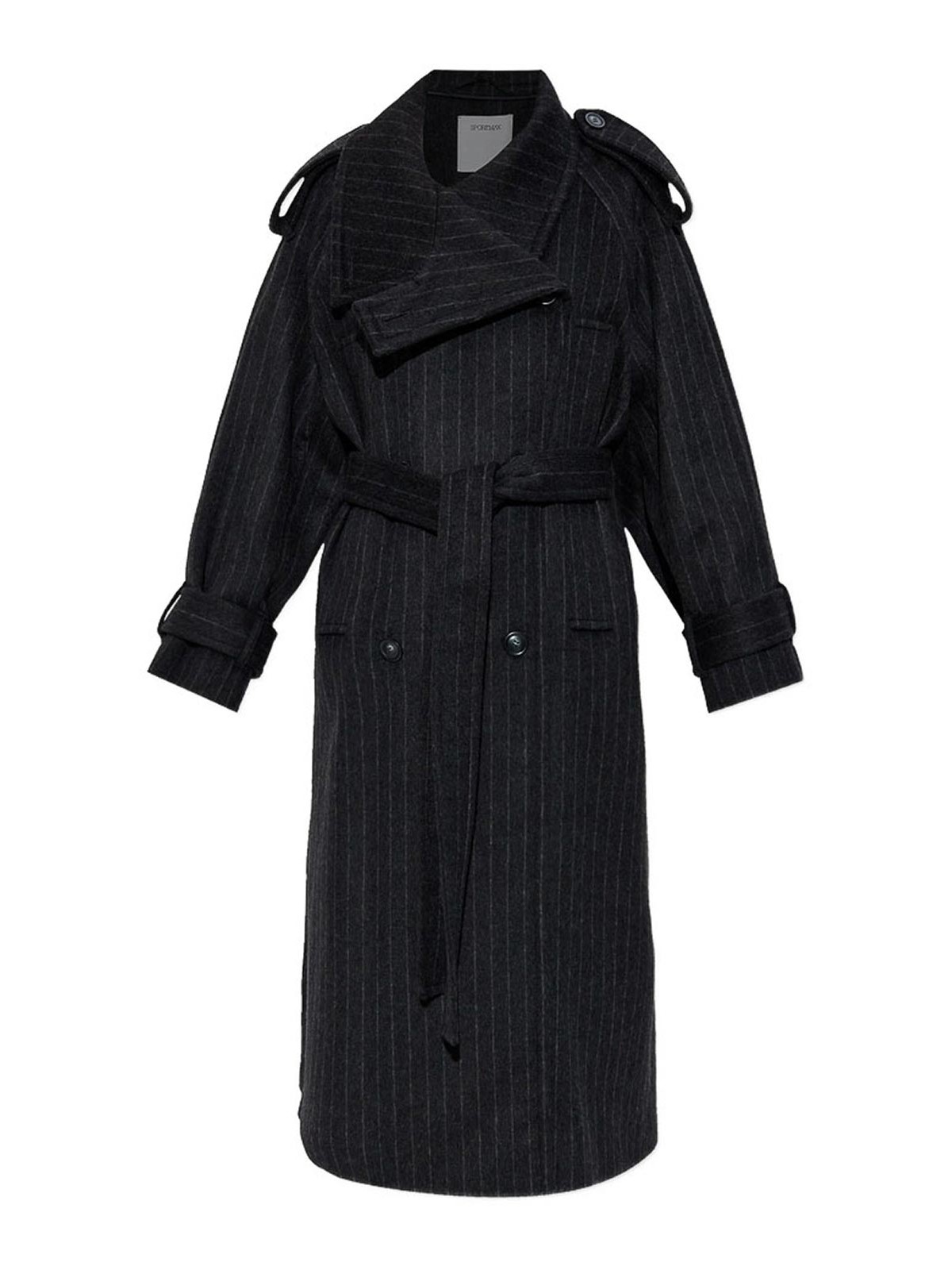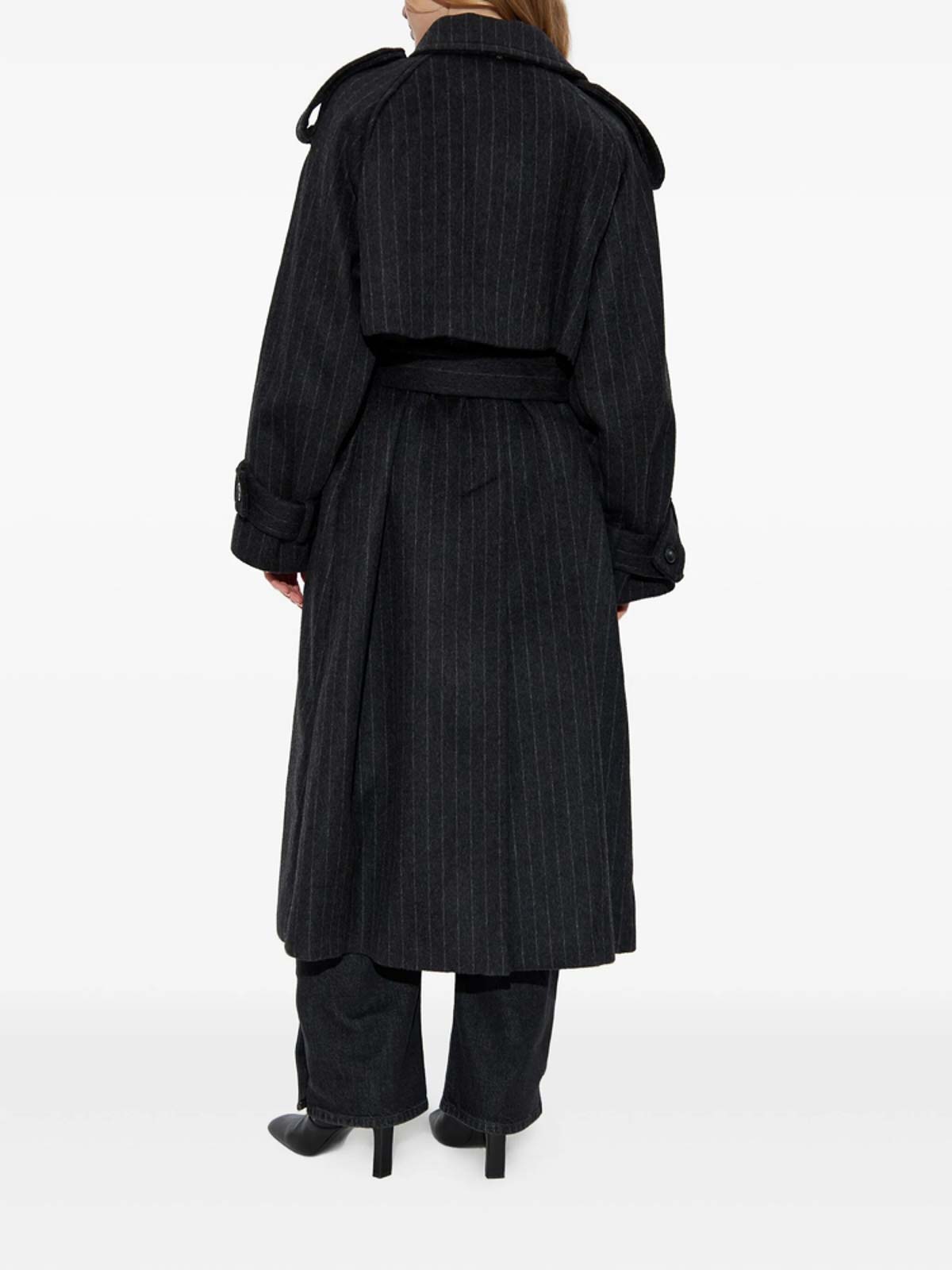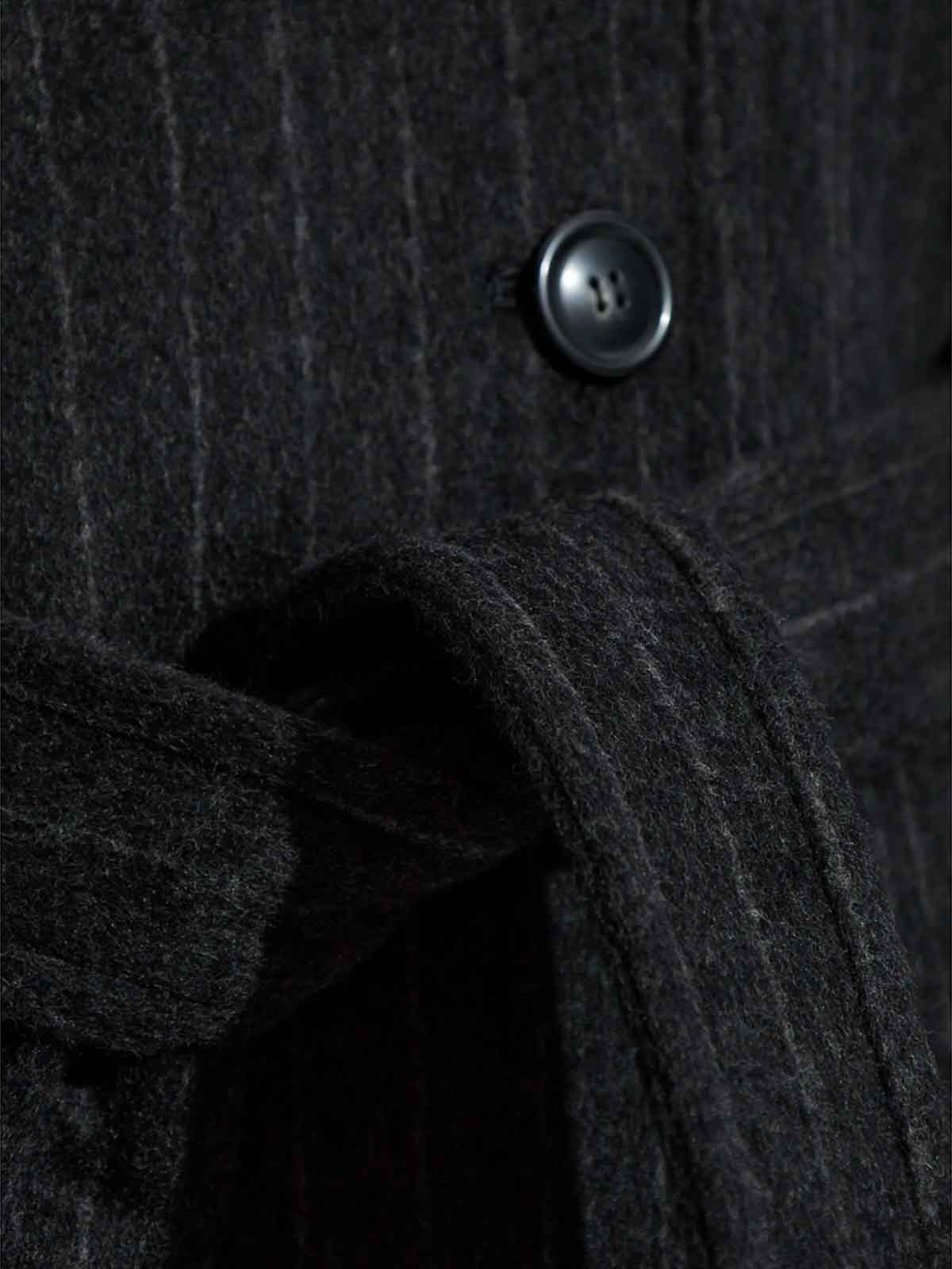 Black pinstripe pattern double-breasted button detachable belt epaulettes buttoned cuffs