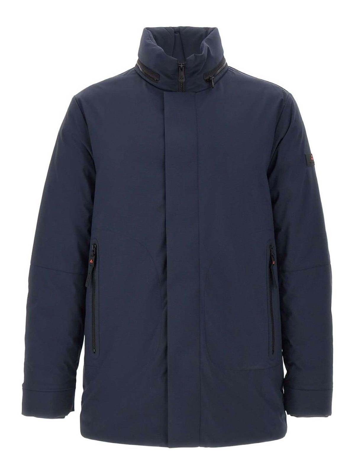 Features navy blue zip hood with double zip and button side zip pockets logo patch