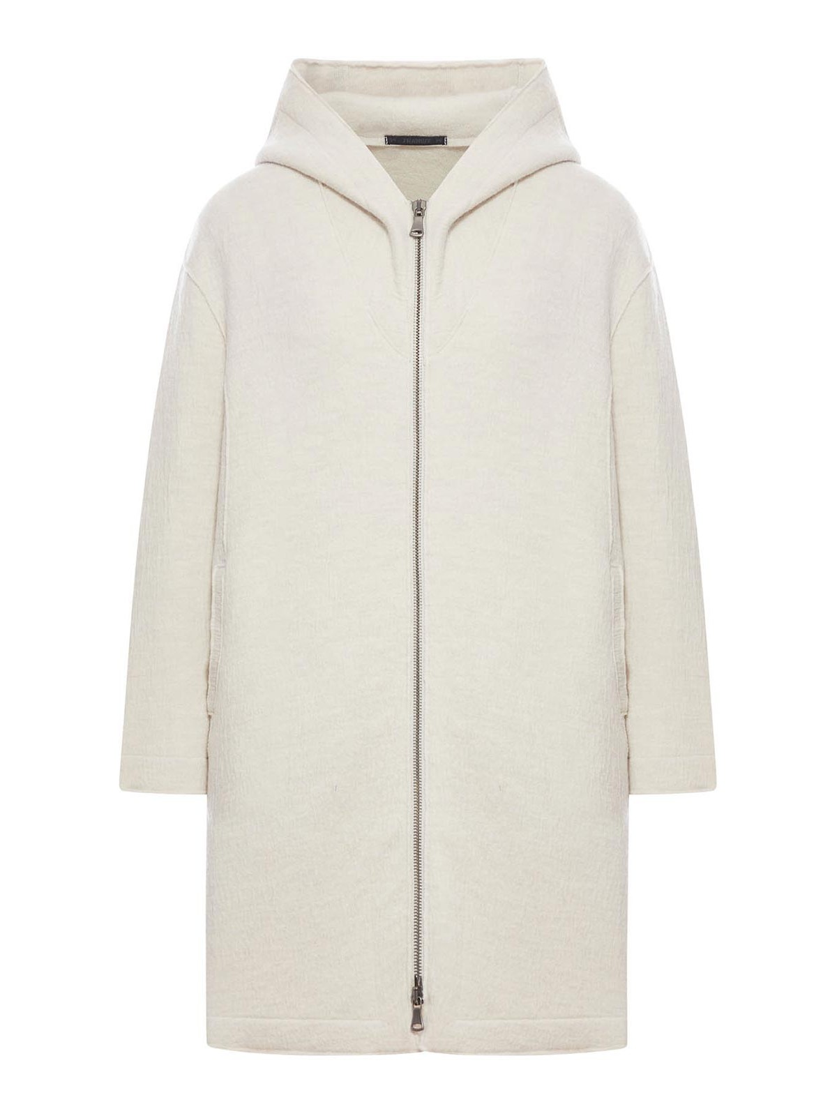 Jacket with hood, raw cut, wide knee, length egg, shaped, double, slider zip on the center, welt pockets, long sleeves, - color chalk