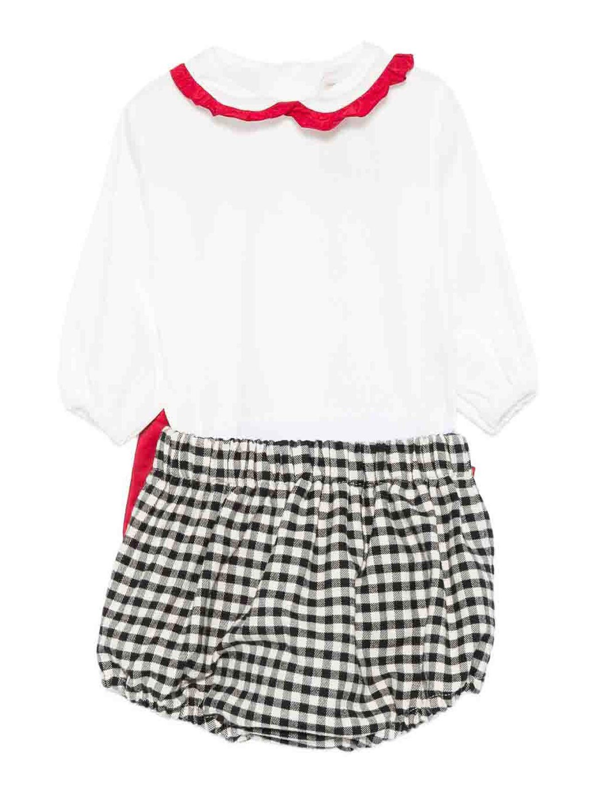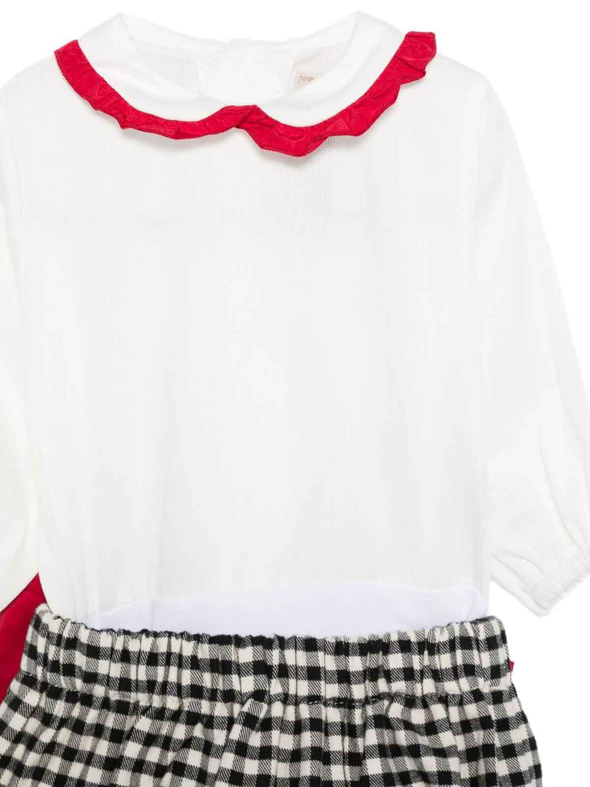 Suit with white bow, collar with ruffles, bow detail, elasticated waist