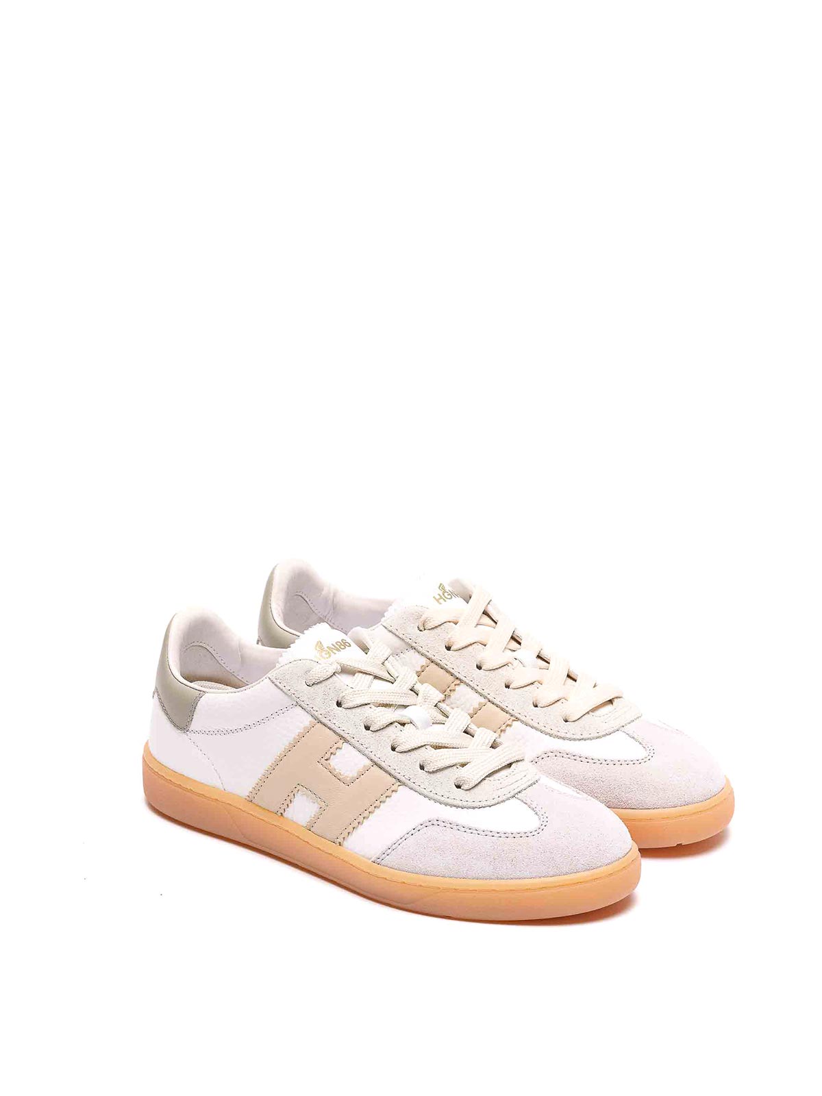 Hogan white cool sneakers, round toe, lateral h logo, leather and suede upper, laces closure