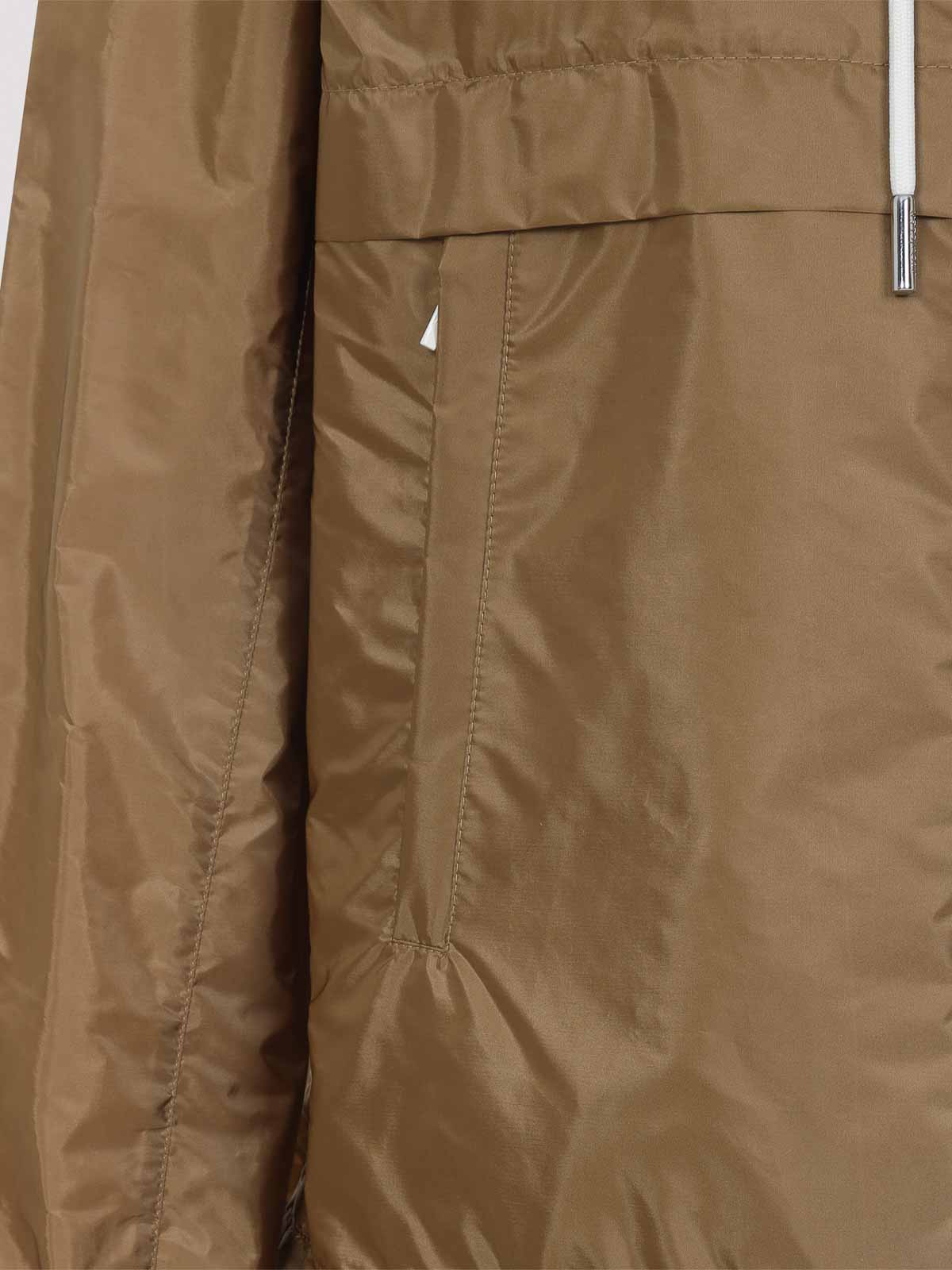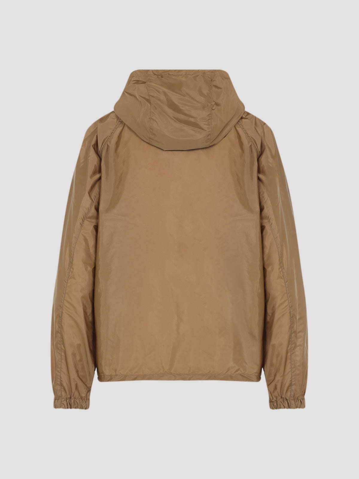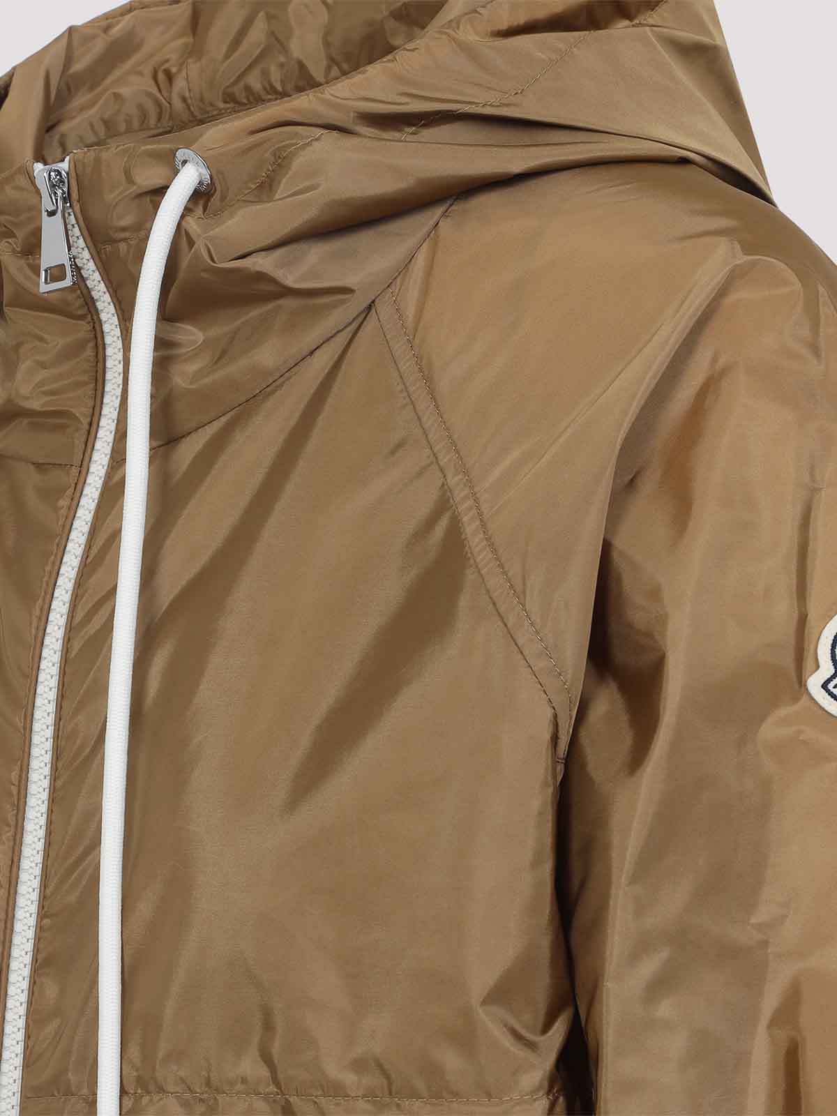 Moncler coquelicot beige nylon jacket. water-repellent jacket crafted from beige nylon, featuring a hood with drawstring, a two-way zip fastening on the front, side zip pockets, long raglan sleeves, a logo patch detail on the sleeve, elastic cuffs, and concealed drawstring at the hem.