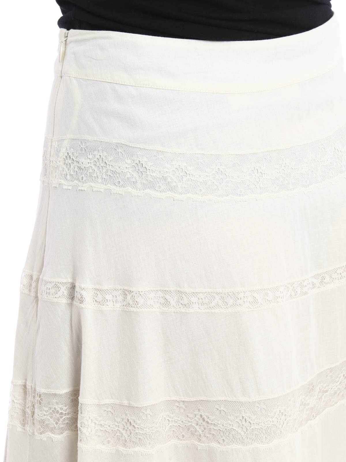 Long cotton A-line skirt featuring horizontal sheer lace inserts, side zip closure and tonal cotton lining.