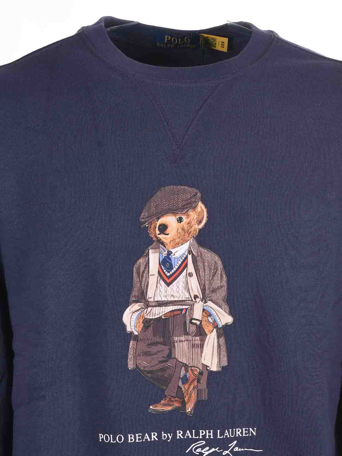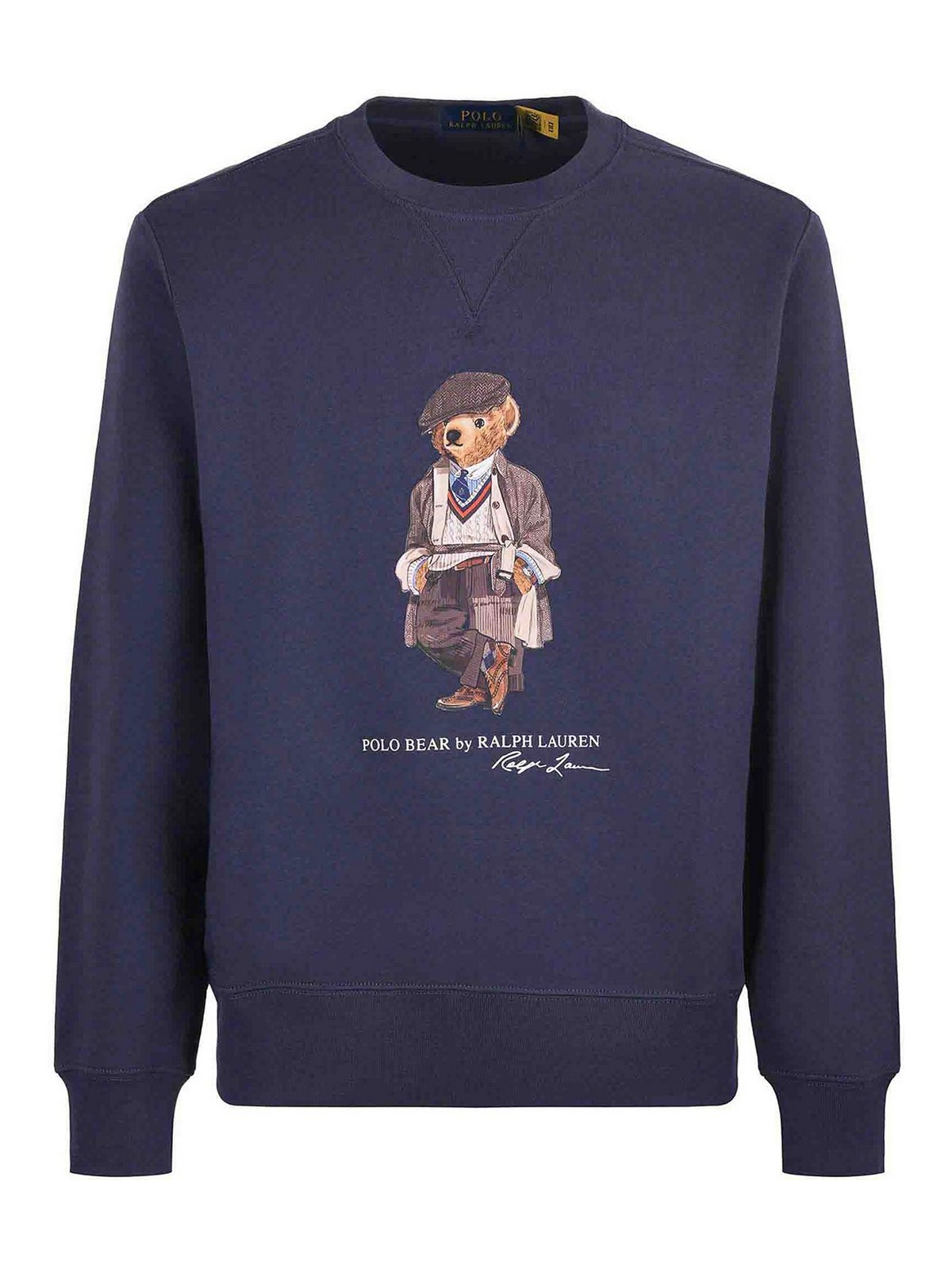 Polo ralph lauren cotton blend sweatshirt in dark blue. ribbed crewneck. polo bear print on the front. ribbed cuffs and hem. fleece lining. size shown: m 66% cotton, 34% polyester