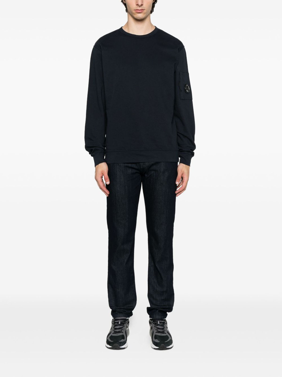 Dark blue crew neck long sleeves cotton logo detail c.p. company suggests removing any detachable accessories before washing.