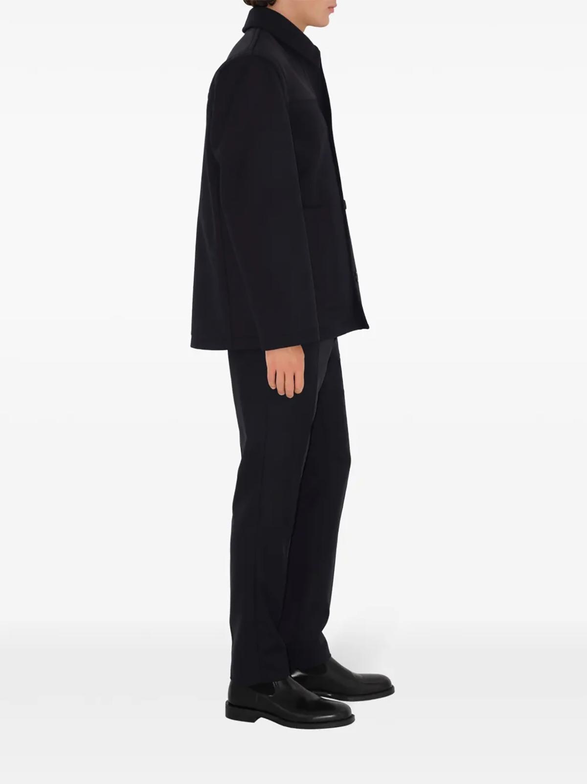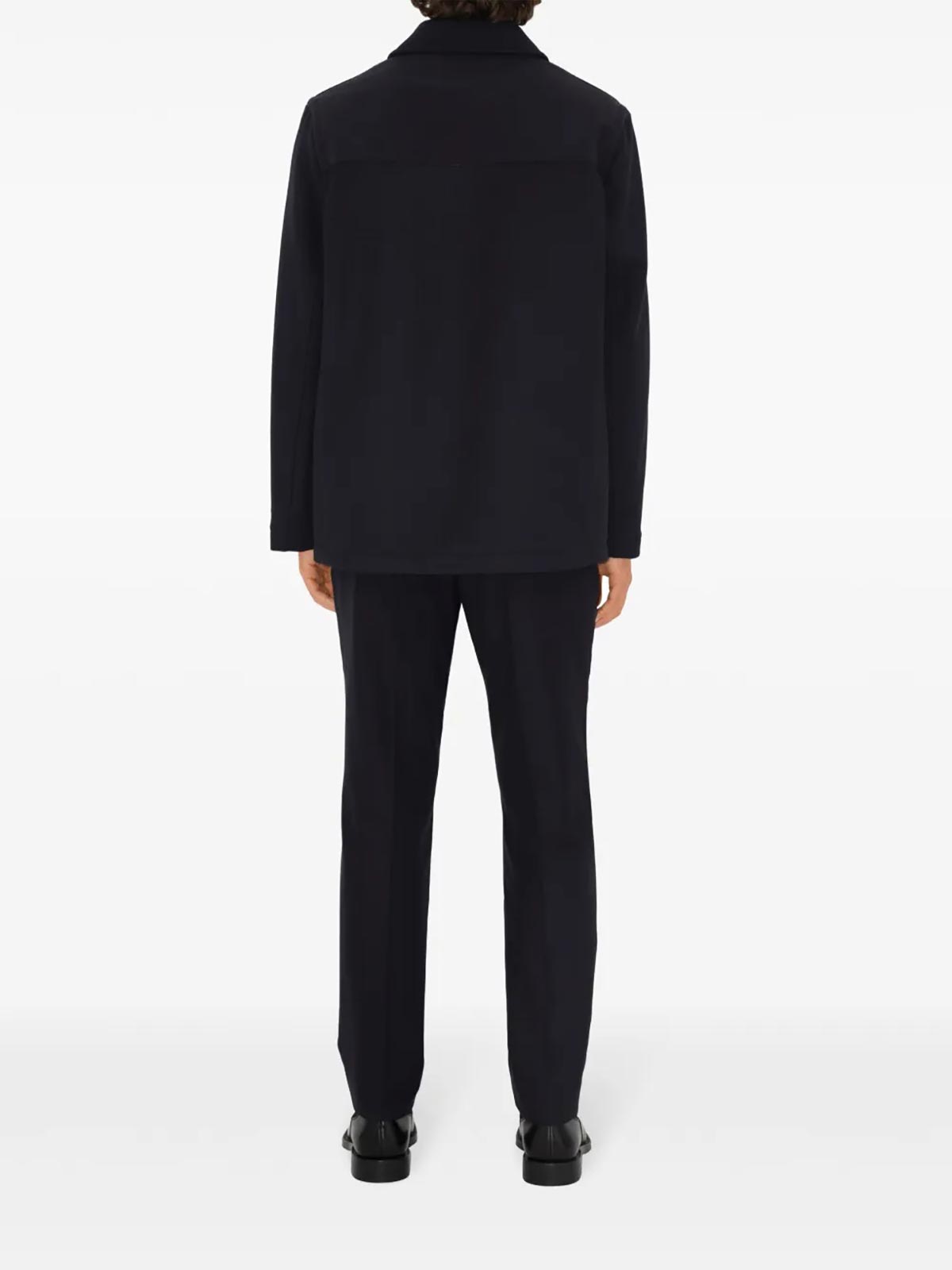 designer color: black, black, wool, classic collar, front button fastening, long sleeves, two front patch pockets, straight hem