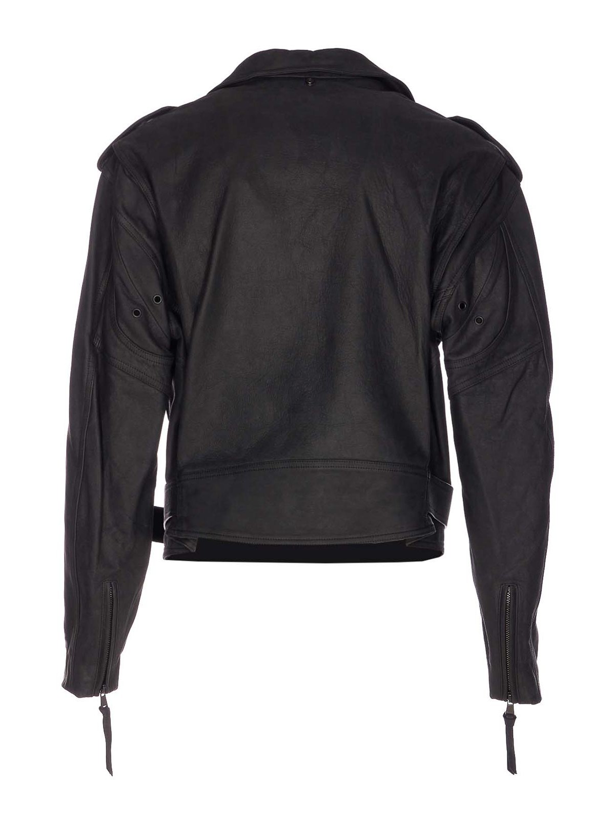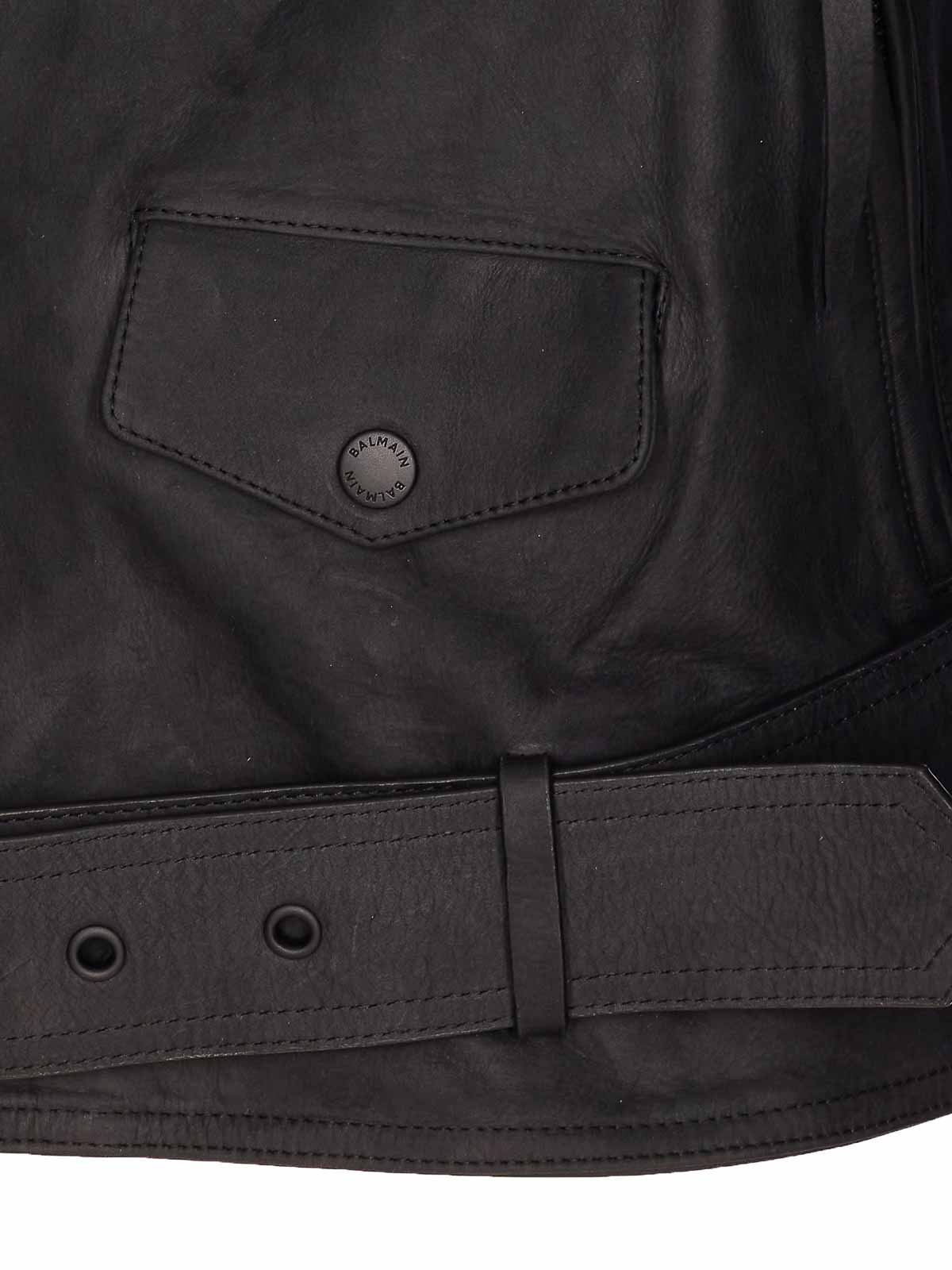 Balmain black cowskin biker jacket with frontal zip closure, long sleeves, zip pockets, pockets, belt on waist, zip pockets