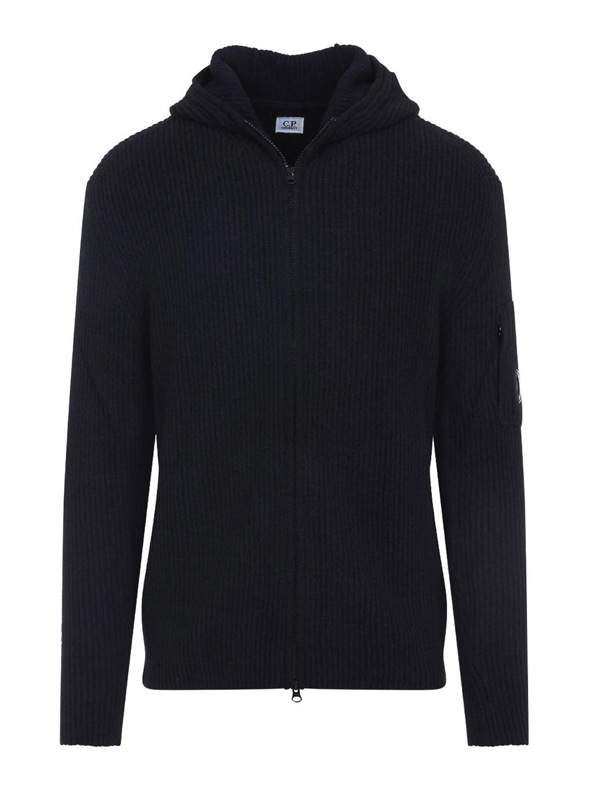 Cp company total eclipse blue cardigan crafted and tonal hood zipped long sleeves patch pocket on the right with patch logo straight hem ribbed all, over