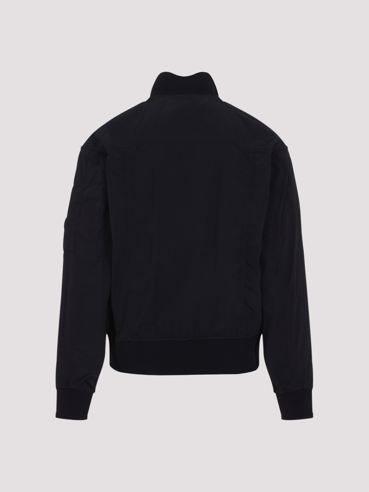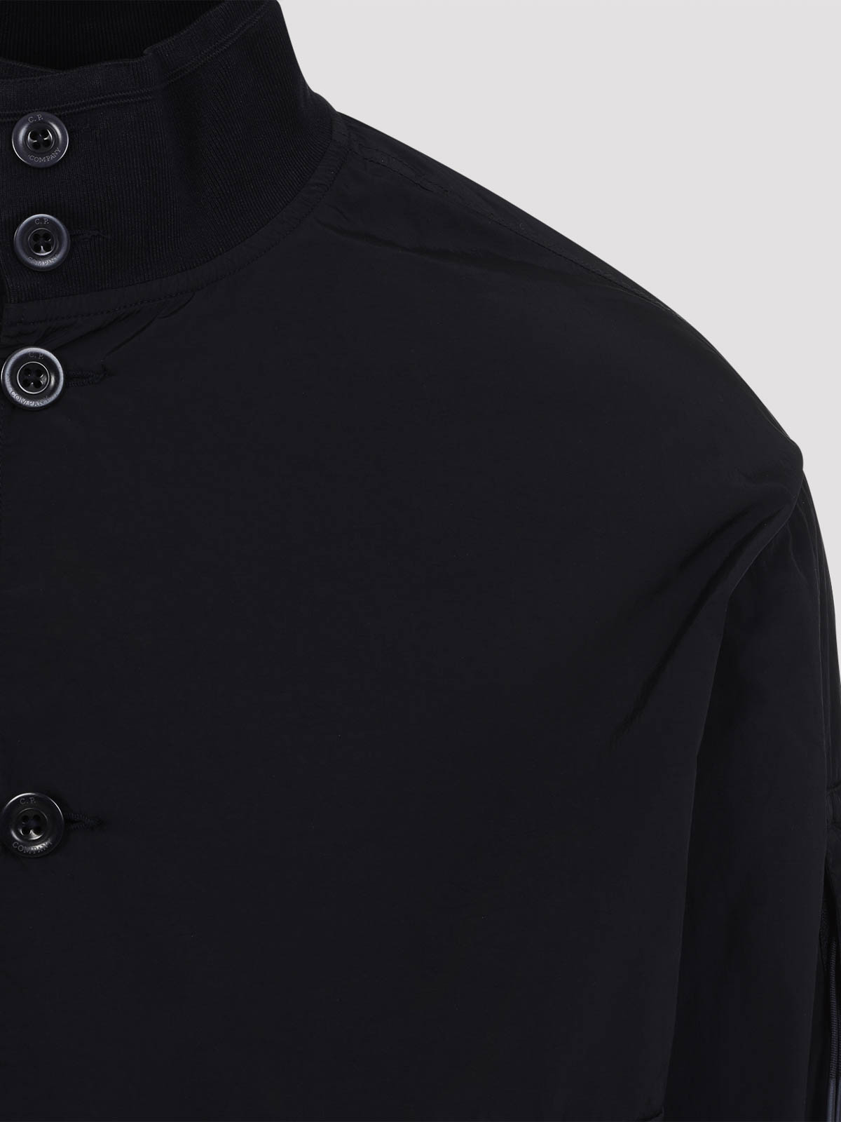 Cp company total eclipse blue chrome-r full button jacket. crafted in polyamide fabric, stand-up collar, front buttoned fastening, side flap buttoned pockets, long sleeves, patch logo on the right sleeve, pocket patch on the right sleeve, ribbed cuffs and hem, straight hem.