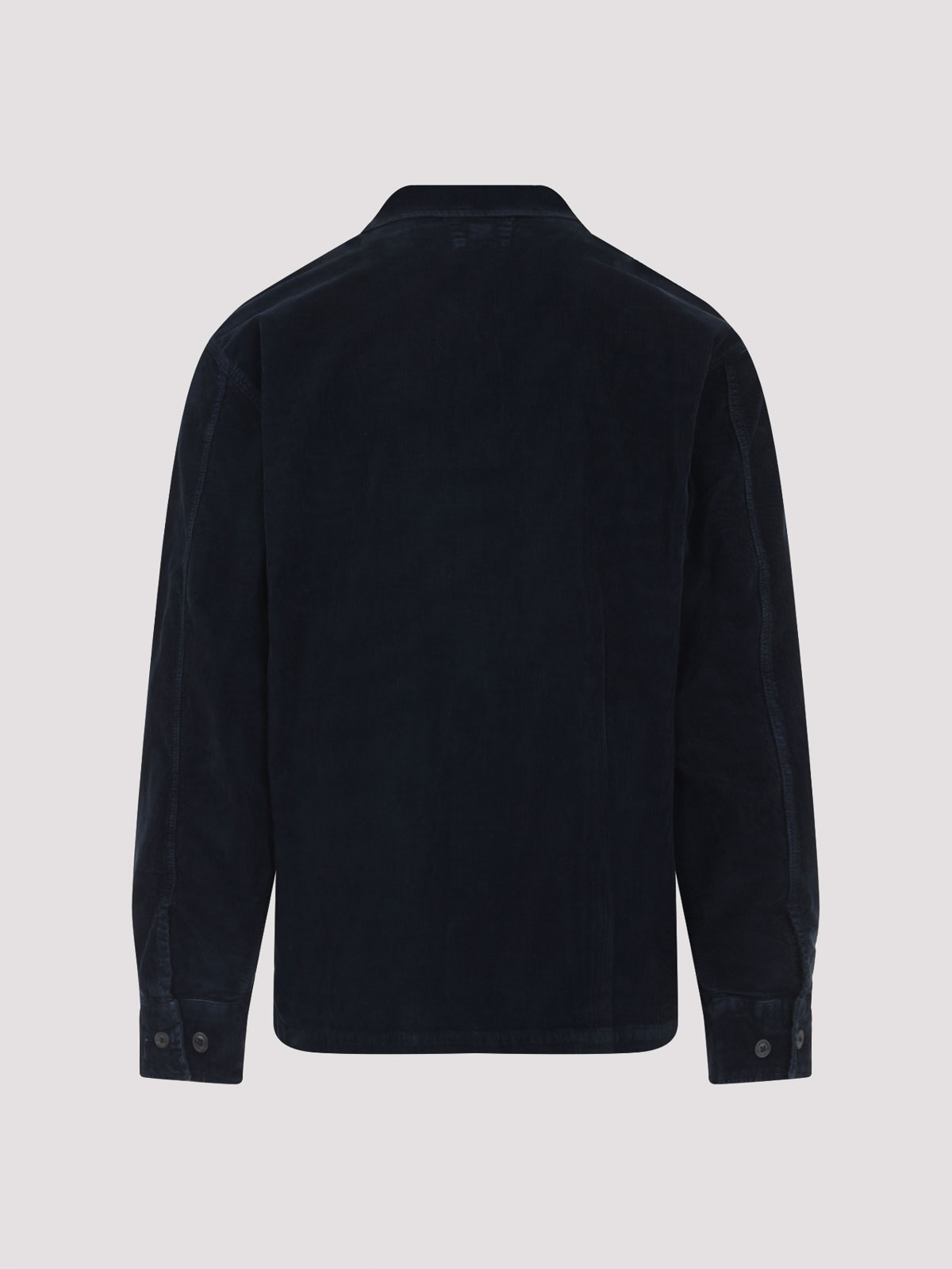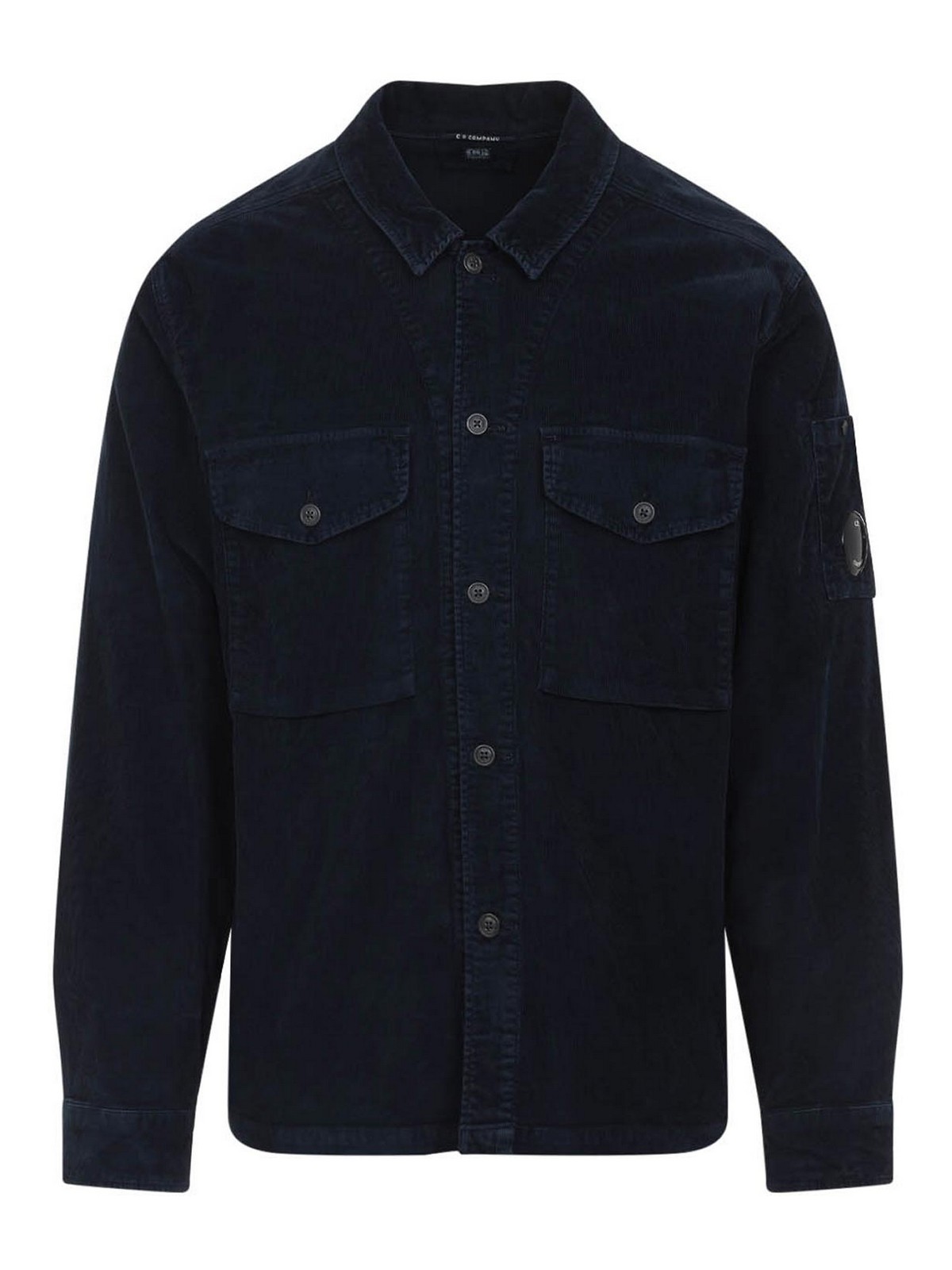 Cp company corduroy dakr blue cotton overshirt. crafted from dark blue cotton corduroy, pointed collar, front button fastening, two flap pockets on the chest, buttoned pocket with lens detail on the sleeve, long sleeves with buttoned cuffs, straight hem, unlined.