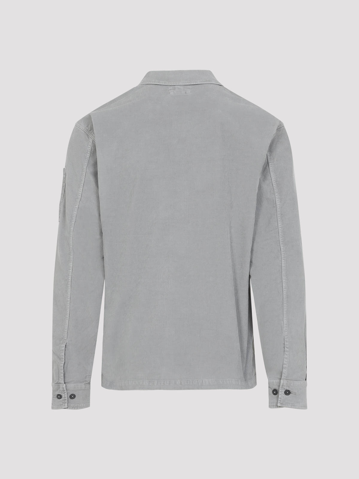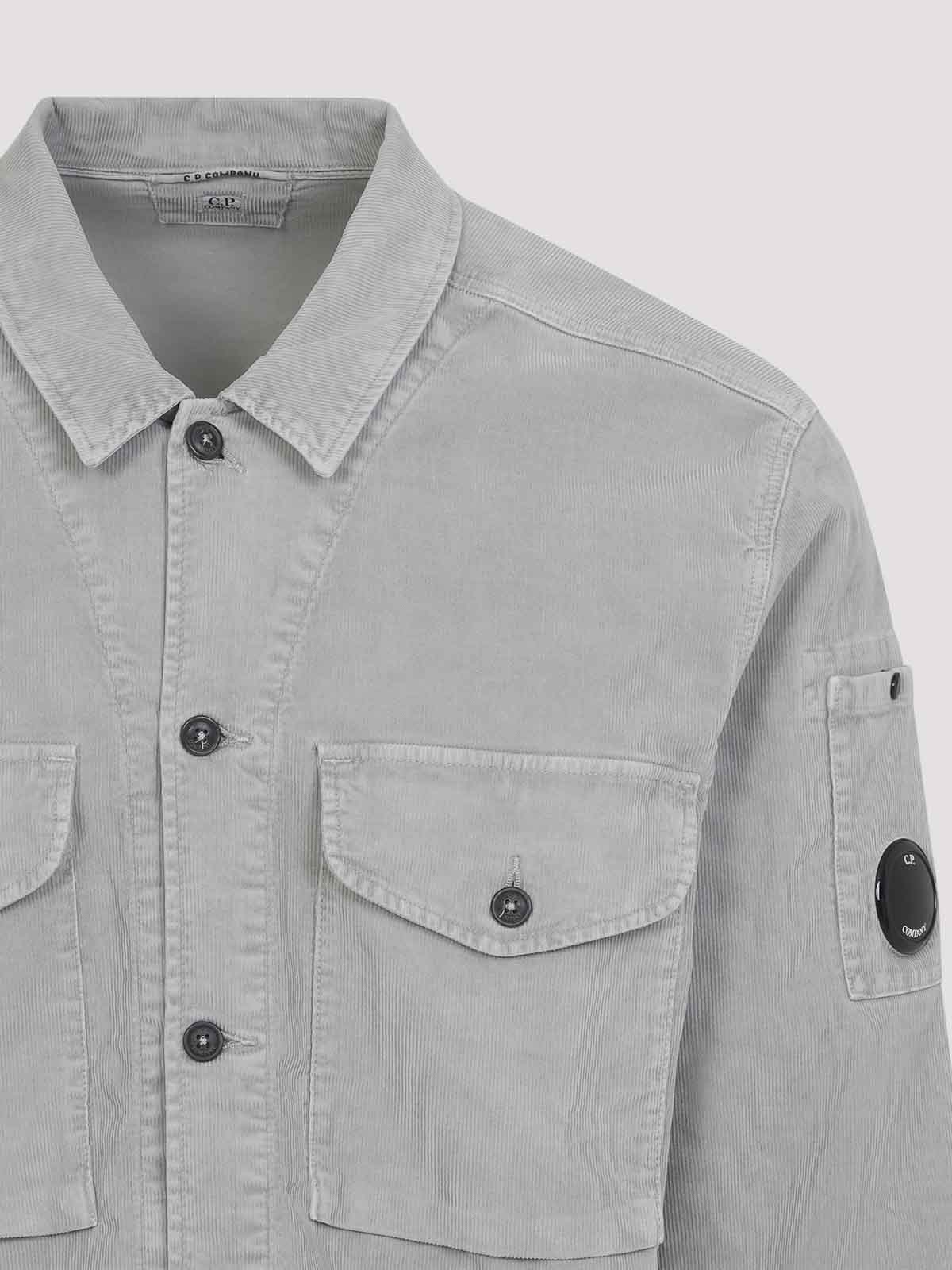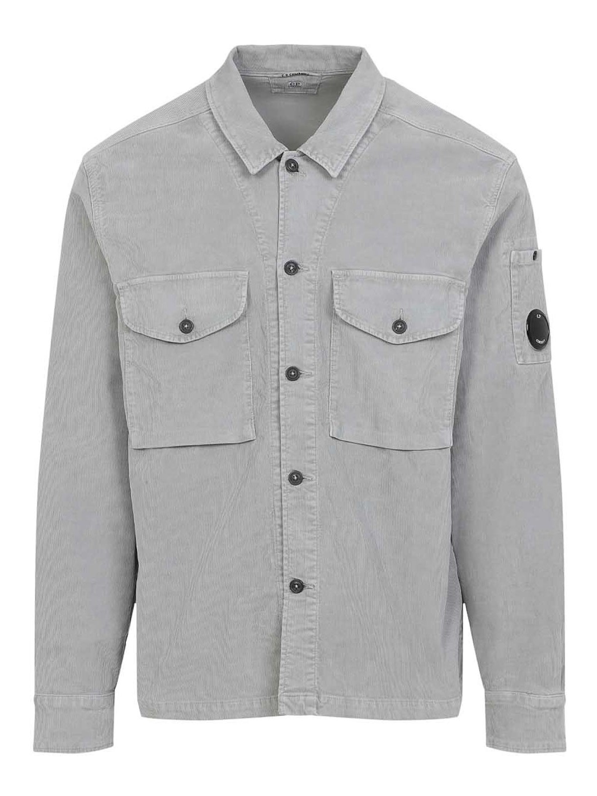 Cp company corduroy light grey cotton overshirt. crafted from light grey cotton corduroy, pointed collar, front button fastening, two flap pockets on the chest, buttoned pocket with lens detail on the sleeve, long sleeves with buttoned cuffs, straight hem, unlined.