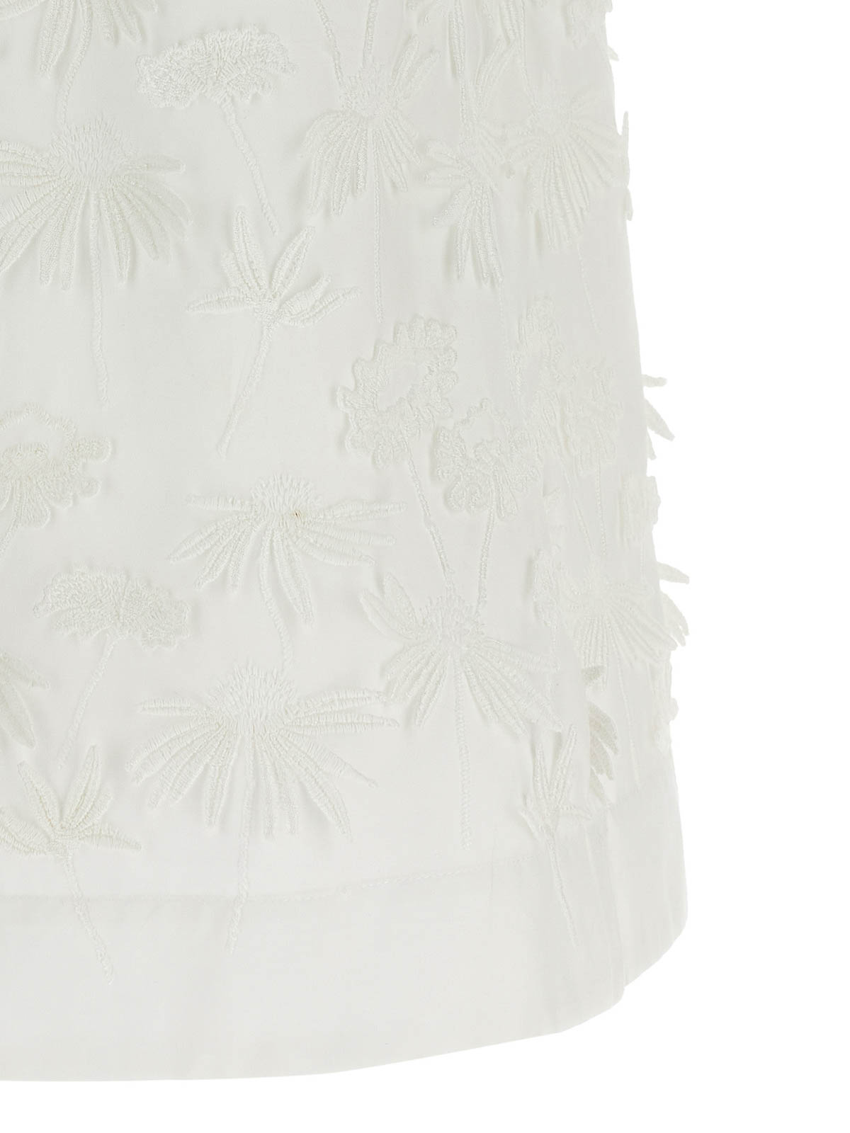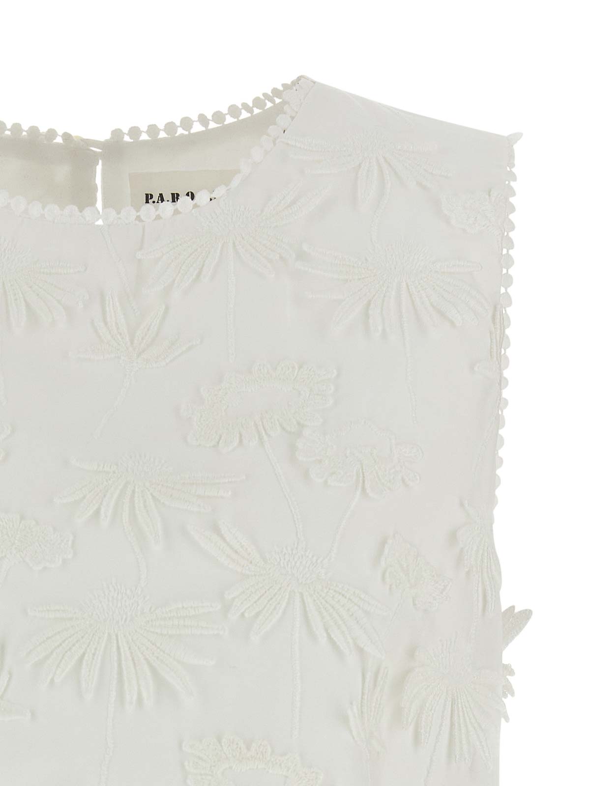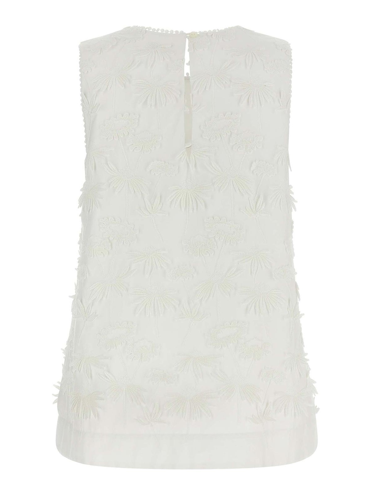 cubo26' blouse in cotton poplin with floral embroidery and tone-on-tone trimmings, round neckline with back button closure and sleeveless back teardrop cut-out detail.