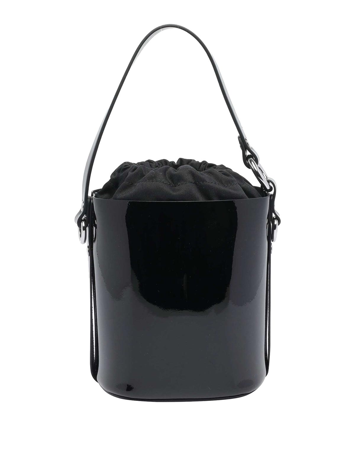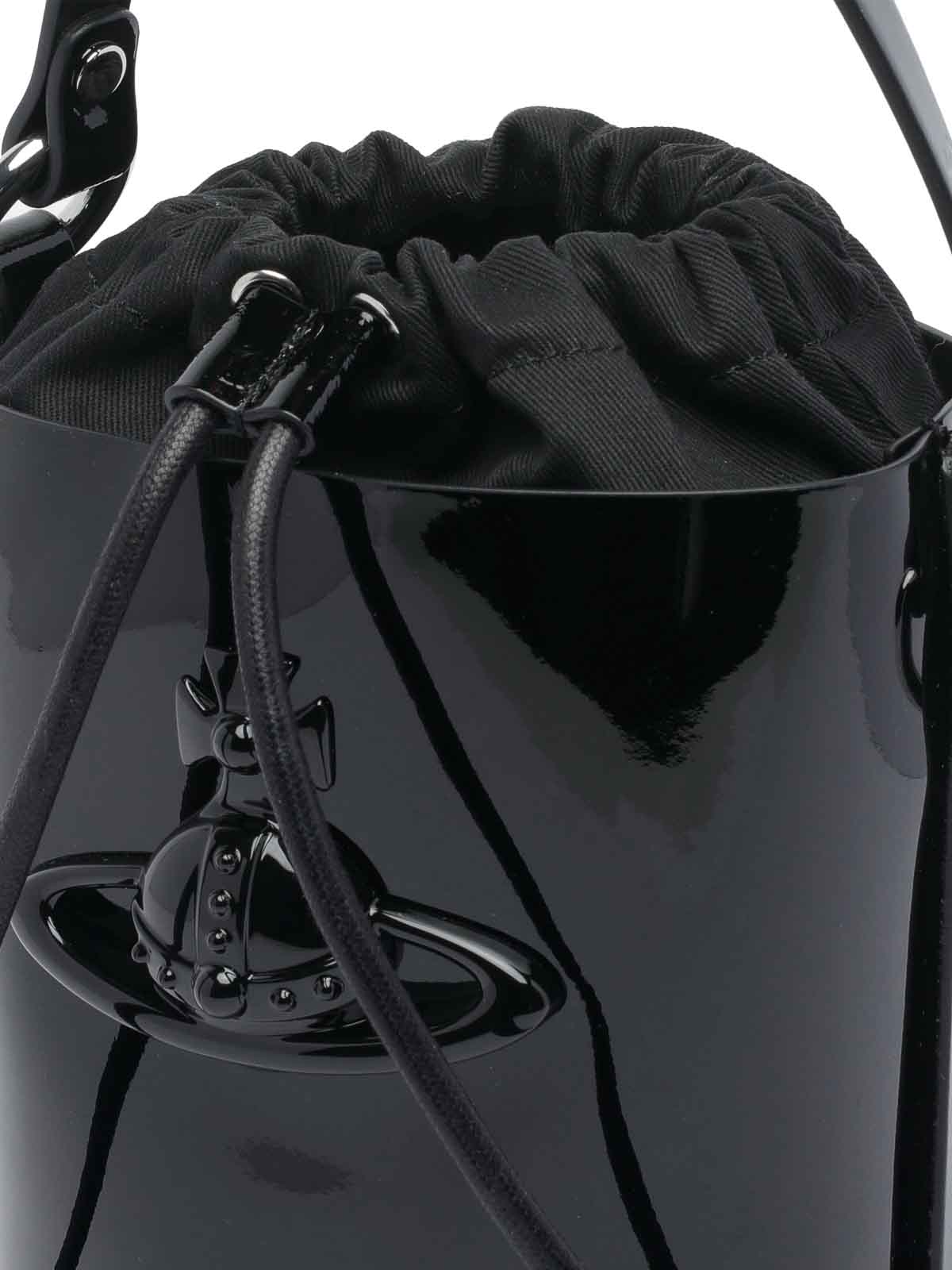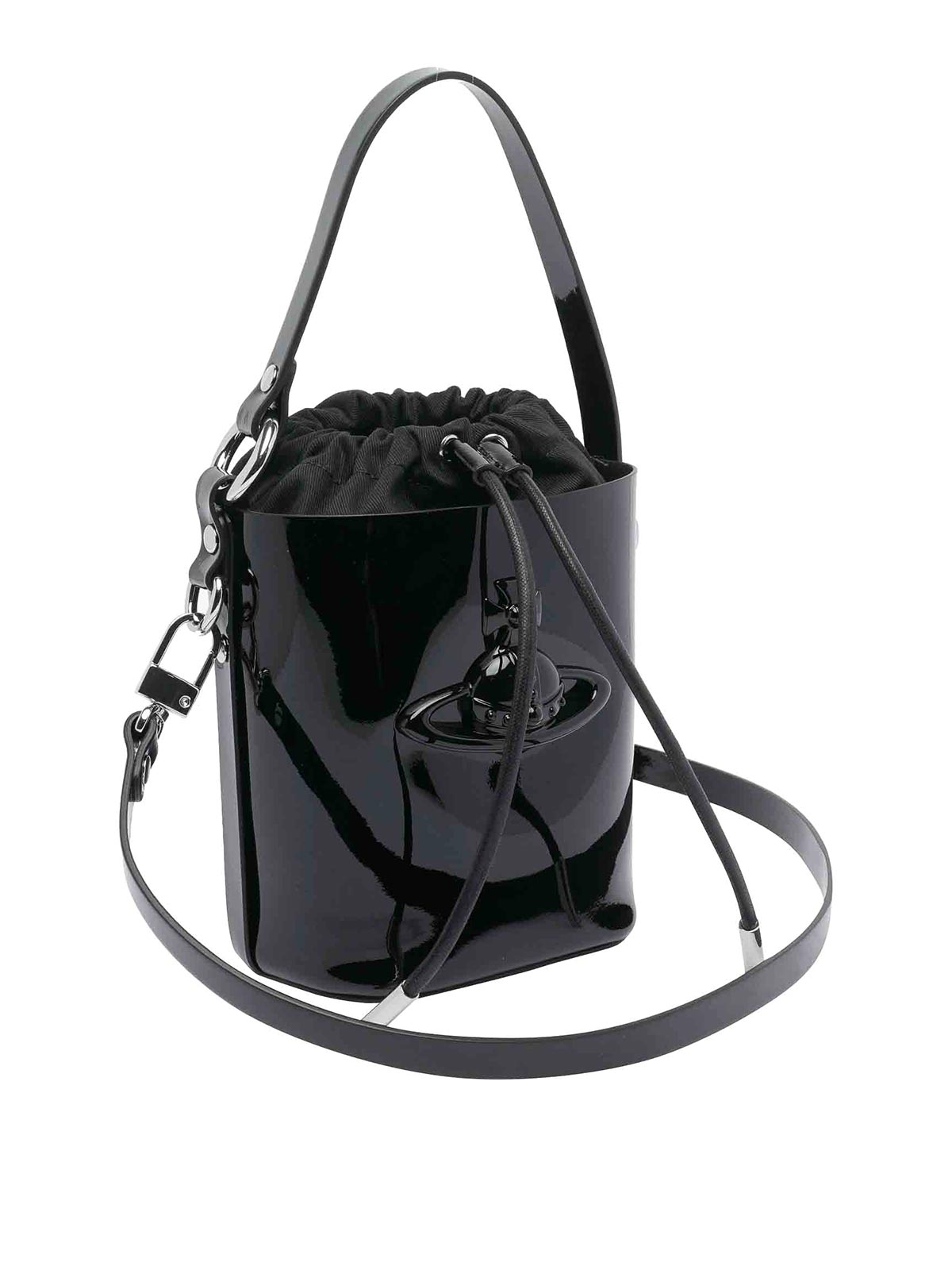 Vivienne westwood black daisy bucket bag drawstring frontal logo tone sur tone top strap polished finish