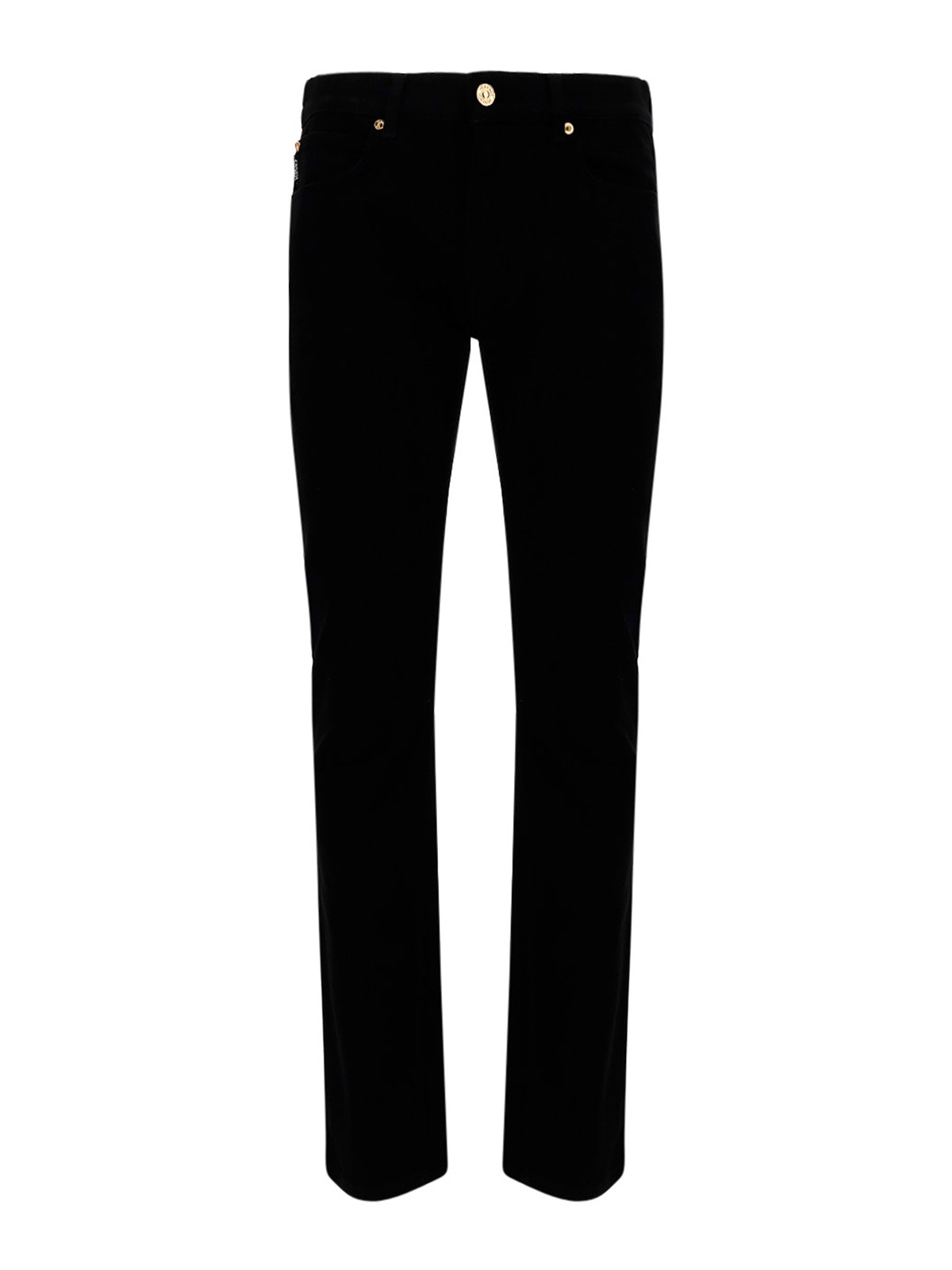 Denim jeans detailed with rear Medusa Head embroidery and zip and button closure.