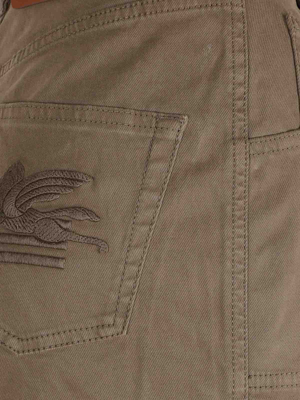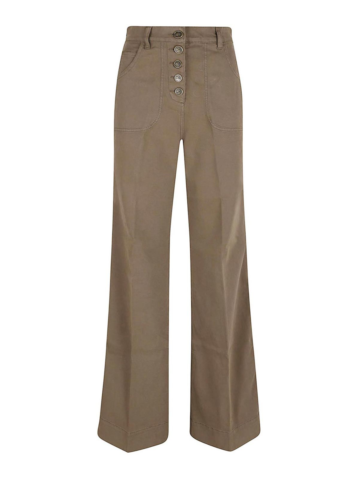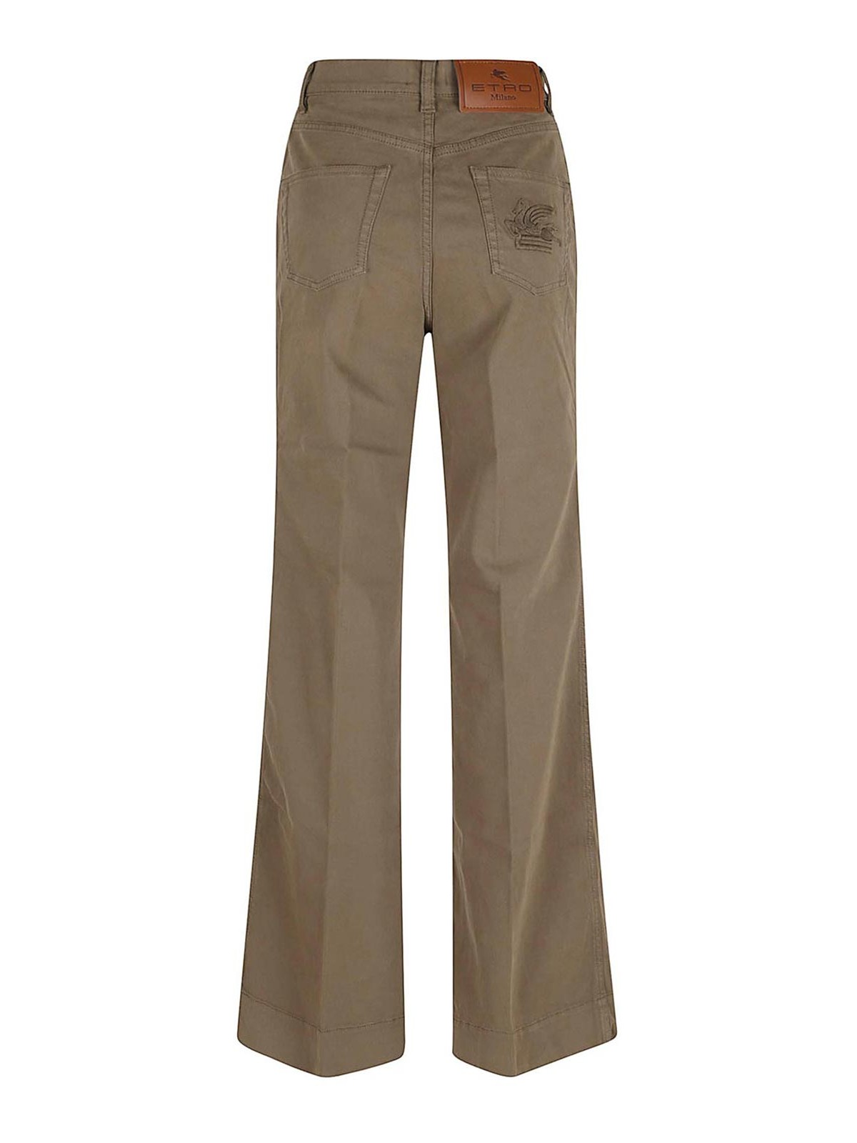 Slightly stretch cotton denim jeans by etro, high-waisted, with a Pegasus button closure, five pockets, and a regular fit with a flared silhouette, tight at the hips and flared from the knee to the bottom. Featuring a label with the Etro and Pegasus logo in leather, and a Pegasus embroidery on the back pocket.