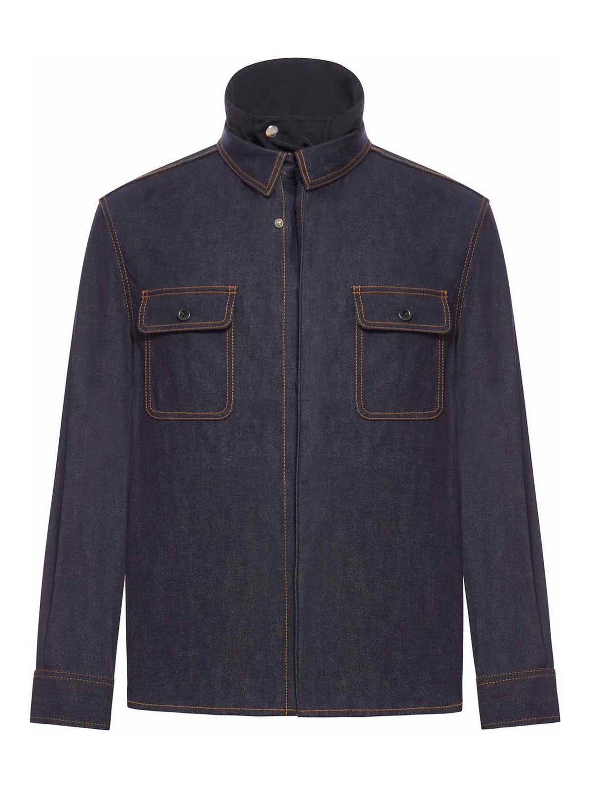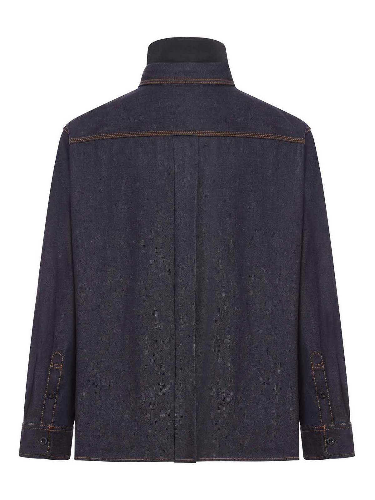 Denim, classic collar, high collar in technical, concealed button placket, two patch pockets with flaps and buttons, adjustable buttoned cuffs, stitching, center pleat on the back, - / black