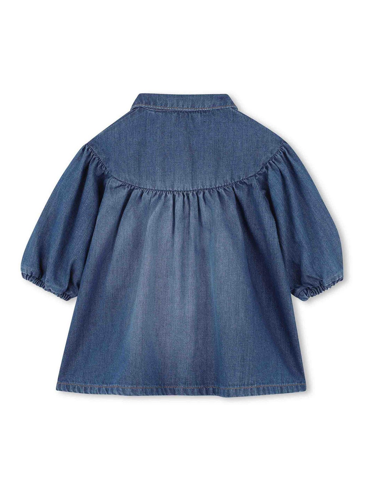 Blue balloon sleeves French collar on the front with buttoning, two front patch pockets with ruching on the back