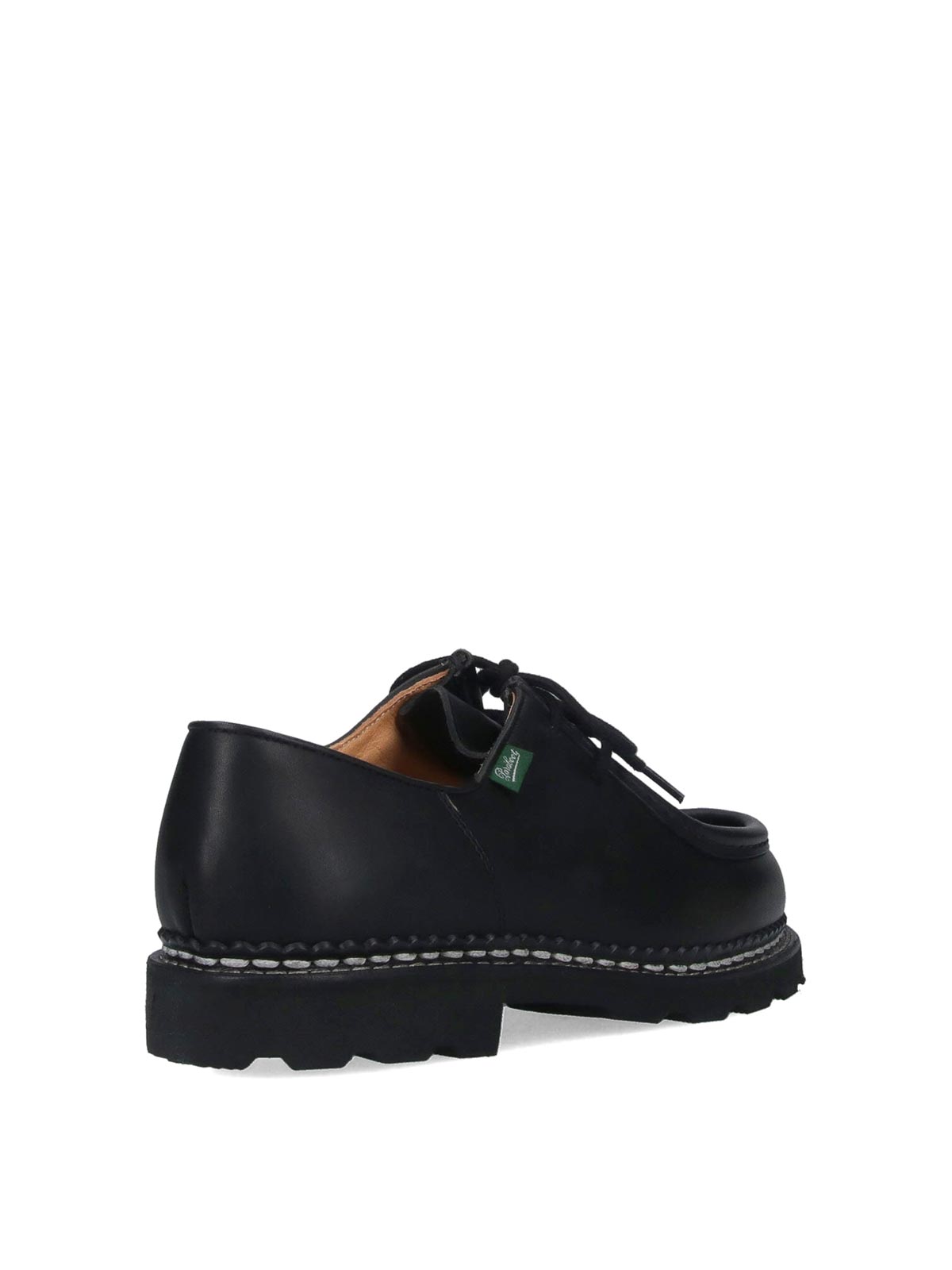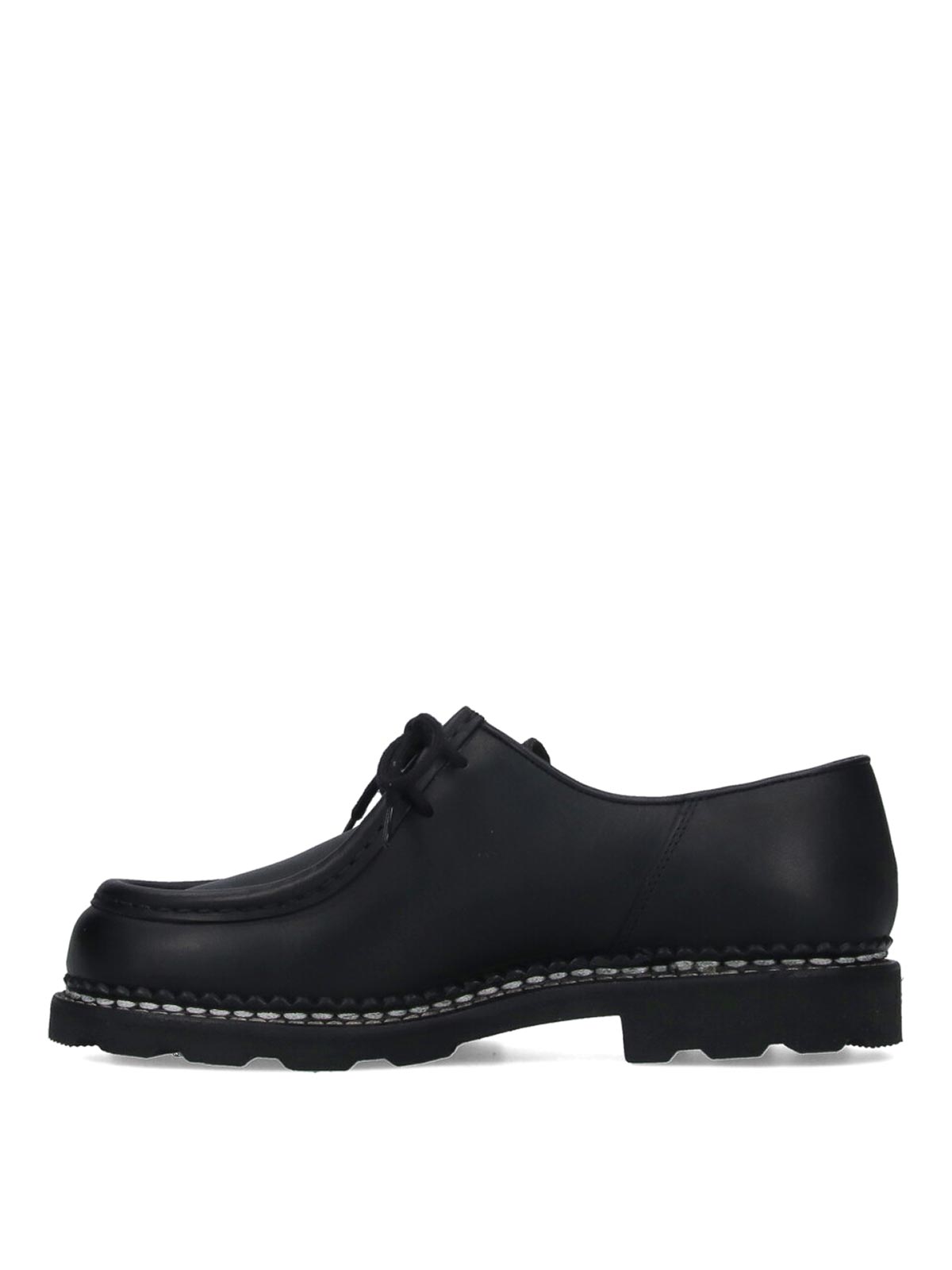 michael paraboot derby shoes, in black calfskin, round toe, lace closure, contrasting logo label detail on the front, contrasting stitching, rubber sole.