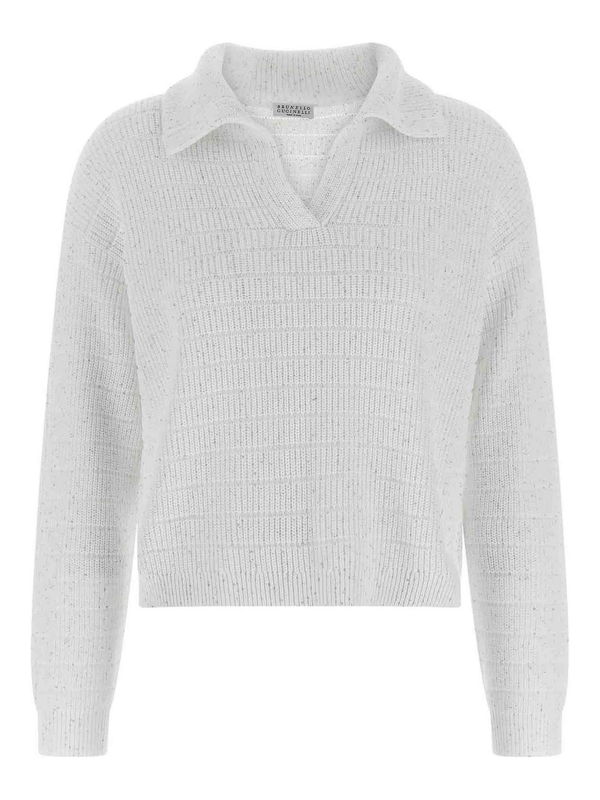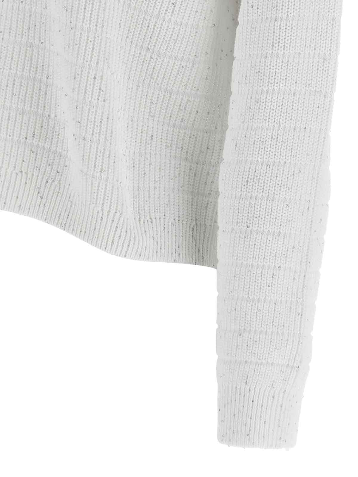 Cotton knit polo shirt english half-ribbed diamond texture with all-over sequin application, slightly crop model, collar, v-neck, long sleeves with cuffs and dropped shoulder.